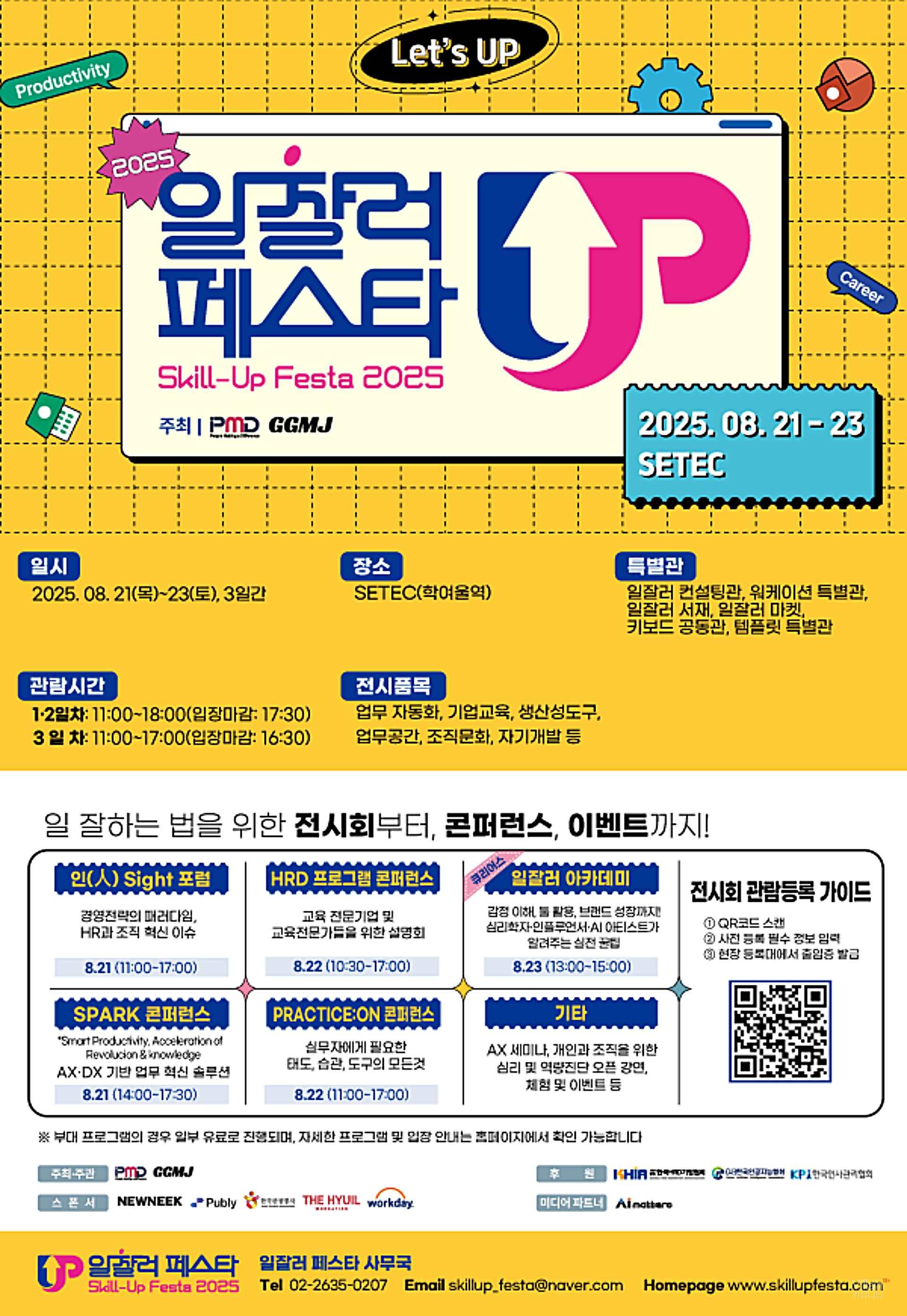 서울 학여울역 SETEC 전시장에서 8월 21일부터 23일까지 ‘2025 일잘러 페스타(Skill-Up Festa)’가 열린다. 국내 유일의 업무 생산성 페스티벌로, 디지털 업무 도구와 실무 팁, 현장에서 바로 적용 가능한 아이디어를 직장인과 실무자, 경영진, HR 담당자 등에게 제공한다.