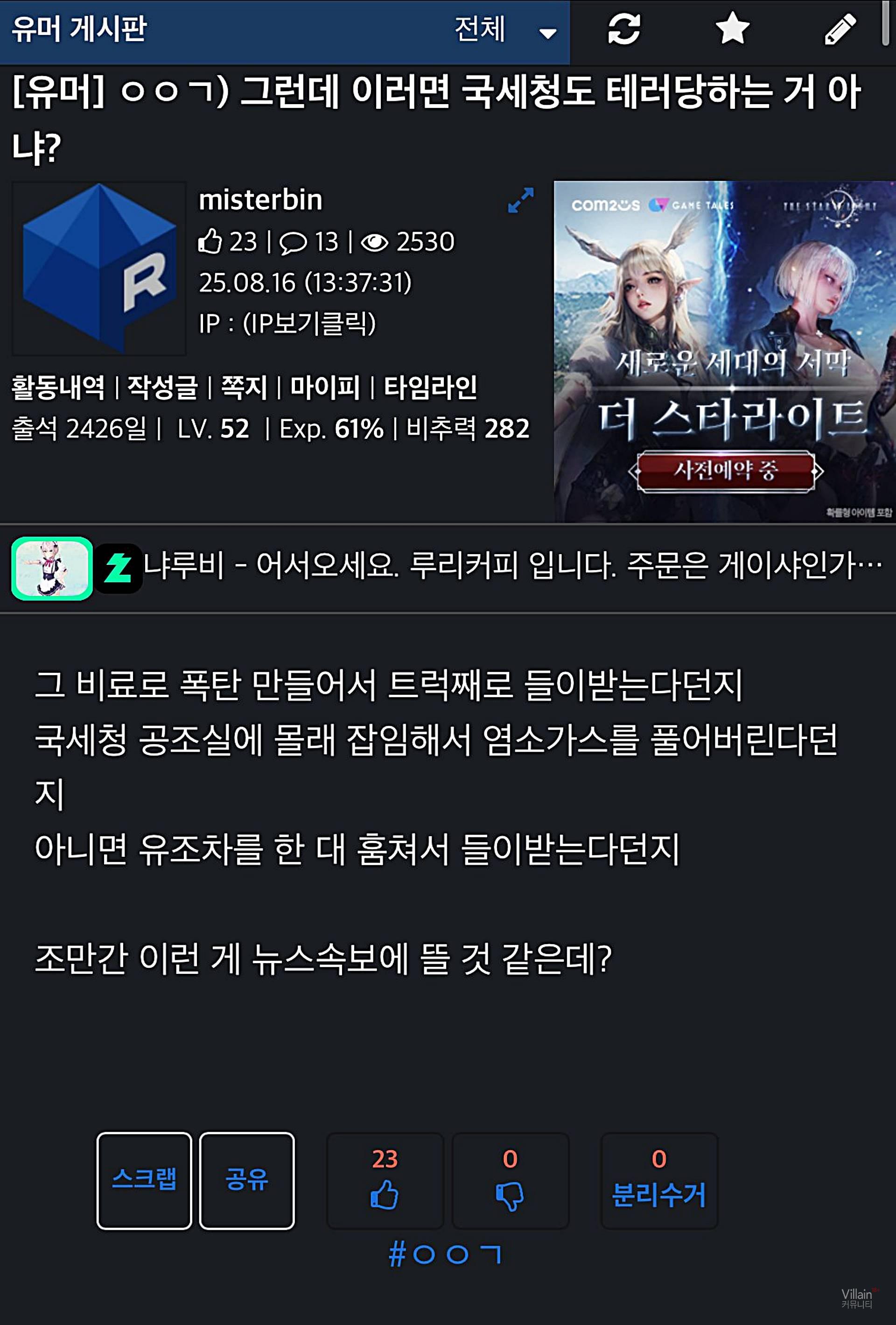 국세청 테러하는거 아니야? 라는 글을 ‘유머게시판’에 남기면서……
