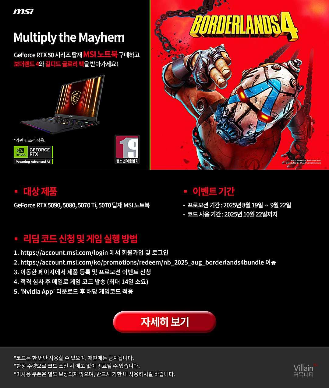 MSI가 RTX 50 시리즈 게이밍 노트북 구매 고객에게 ‘보더랜드 4’ 스탠다드 에디션과 ‘길디드 글로리 팩’을 증정하는 프로모션을 8월 19일부터 9월 22일까지 진행한다.