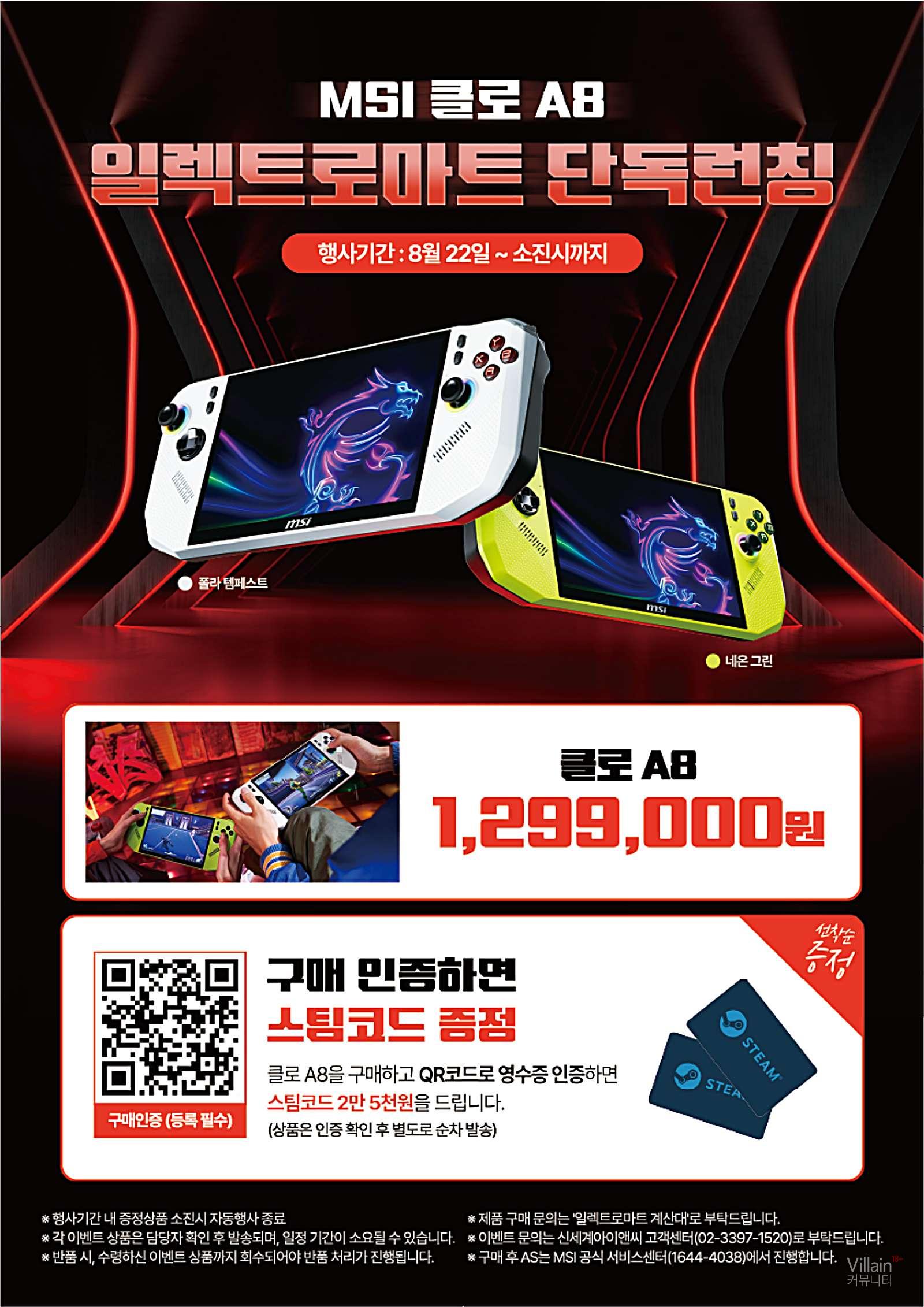 엠에스아이코리아가 AMD 라이젠 Z2 익스트림 프로세서를 기반으로 한 휴대용 게임기 클로 A8 BZ2EM을 출시한다. 신제품은 폴라 템페스트와 네온 그린 두 가지 컬러로 제공되며, 8월 22일부터 전국 일렉트로마트에서 단독 판매된다. 영등포점, 스타필드마켓 킨텍스점, 수원스타필드, 왕십리점, 용산점 등 5개 매장에서 직접 체험도 가능하다.