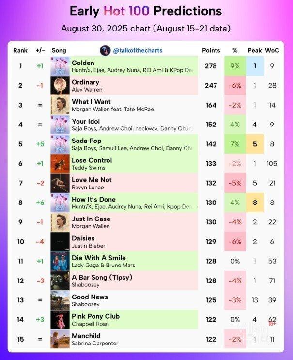 케이팝 데몬 헌터스 골든, 8월 30일자 빌보드 싱글 1위 재탈환 예측