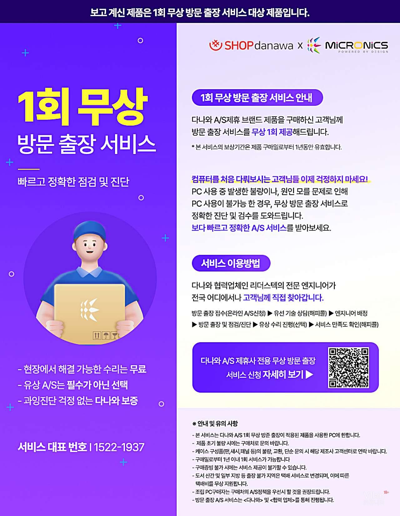 마이크로닉스가 샵다나와 구매 고객을 대상으로 PC 케이스 및 완제 PC에 대해 1년간 1회 무상 방문 출장 서비스를 지원한다. 전문 엔지니어가 직접 방문해 점검과 수리를 진행하며, 택배 서비스도 무상 제공된다.