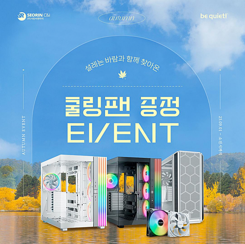 서린씨앤아이가 비콰이어트(be quiet!) 지정 케이스 구매 고객에게 쿨링팬을 증정하는 이벤트를 진행한다. 라이트 베이스 600·900 시리즈 8종 구매 시 라이트 윙즈 LX HS 120mm 팬, 사일런트 베이스 802 시리즈 4종 구매 시 퓨어 윙즈 3 140mm PWM 팬이 제공된다. 이벤트는 9월 1일부터 사은품 소진 시까지 이어진다.