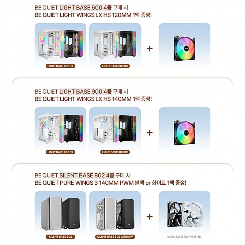 라이트 베이스 600 4종(블랙 LX, 화이트 LX, 블랙 DX, 화이트 DX)과 라이트 베이스 900 4종(블랙 FX, 화이트 FX, 블랙 DX, 화이트 DX)을 구매하면 비콰이어트 라이트 윙즈 LX HS 120mm 1팩이 제공된다. 사일런트 베이스 802 4종(블랙, 화이트, 윈도우 블랙, 윈도우 화이트)을 구매하면 케이스 색상과 동일한 컬러의 퓨어 윙즈 3 140mm PWM 쿨링팬이 제공된다.