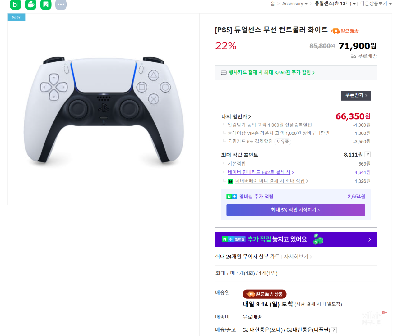 [네이버] [PS5] 듀얼센스 무선 컨트롤러 화이트 66,350원