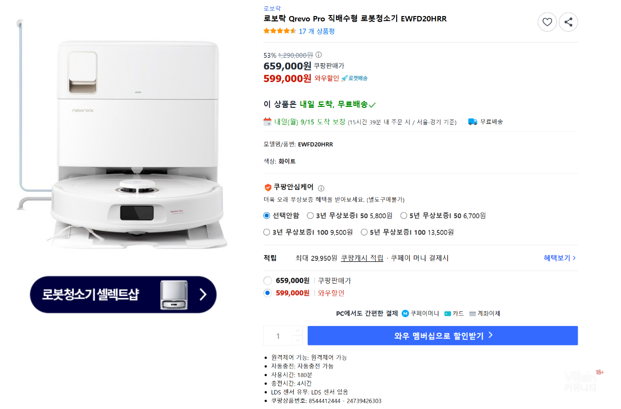 [쿠팡] 로보락 Qrevo Pro 직배수형 로봇청소기 EWFD20HRR 599,000원 와우할인가