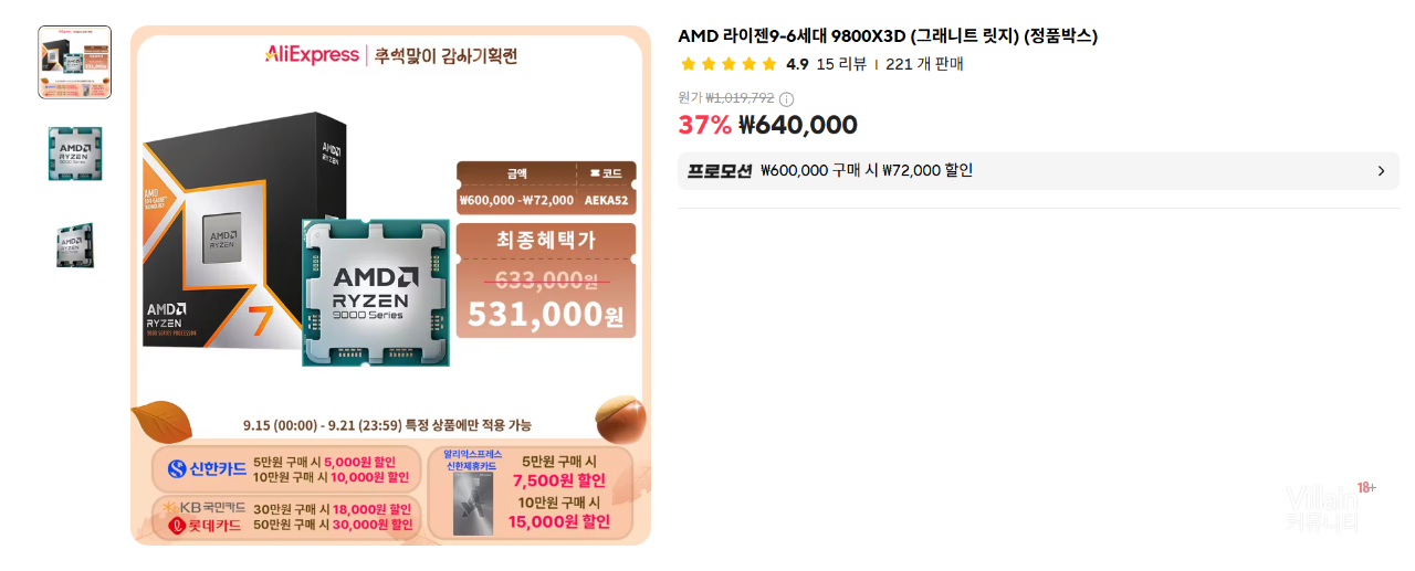 [알리] AMD 라이젠9-6세대 9800X3D (그래니트 릿지) (정품박스) 531,000원