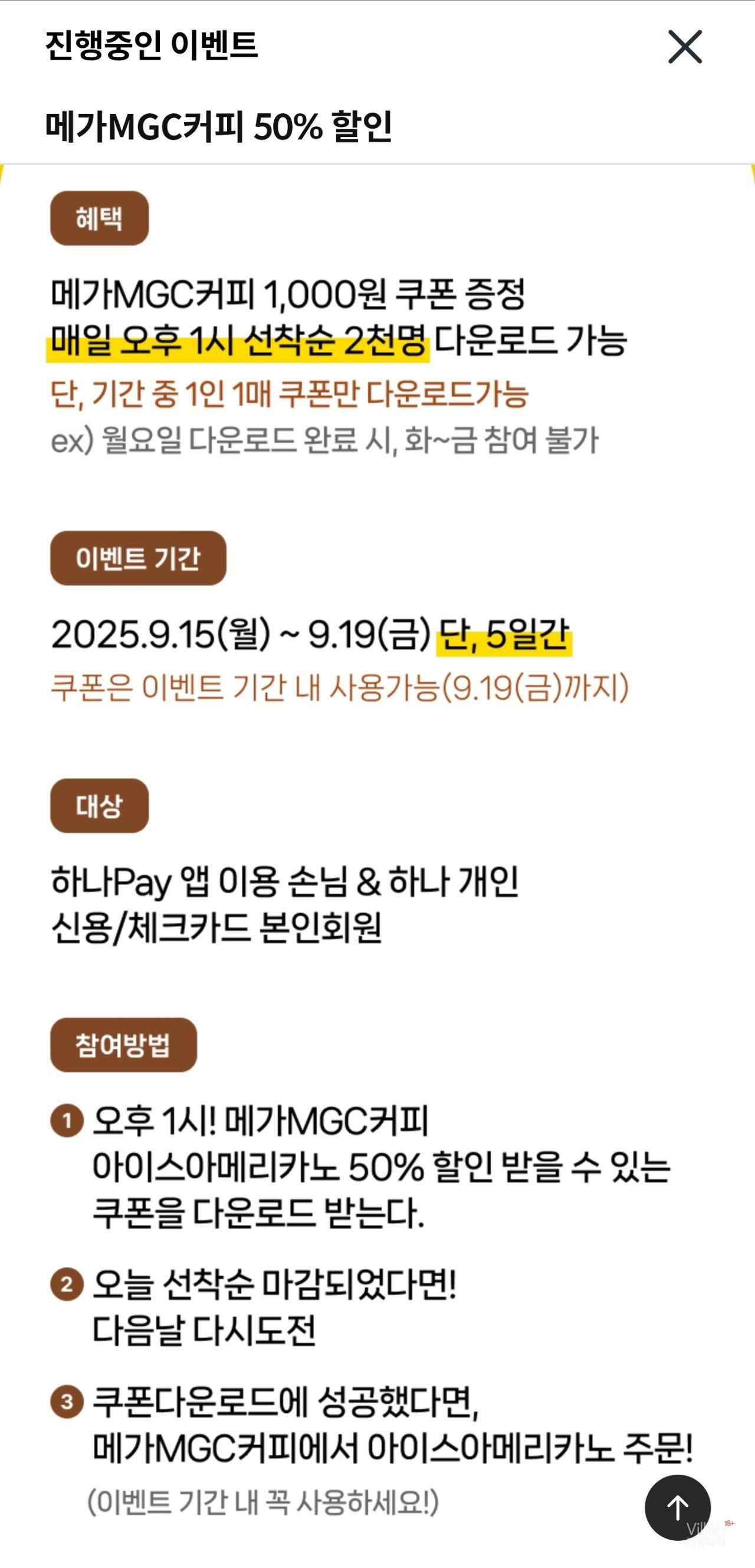 오늘부터 금요일까지 매일 오후 1시에 하나페이에서 메가커피 1000원권 뿌립니다.