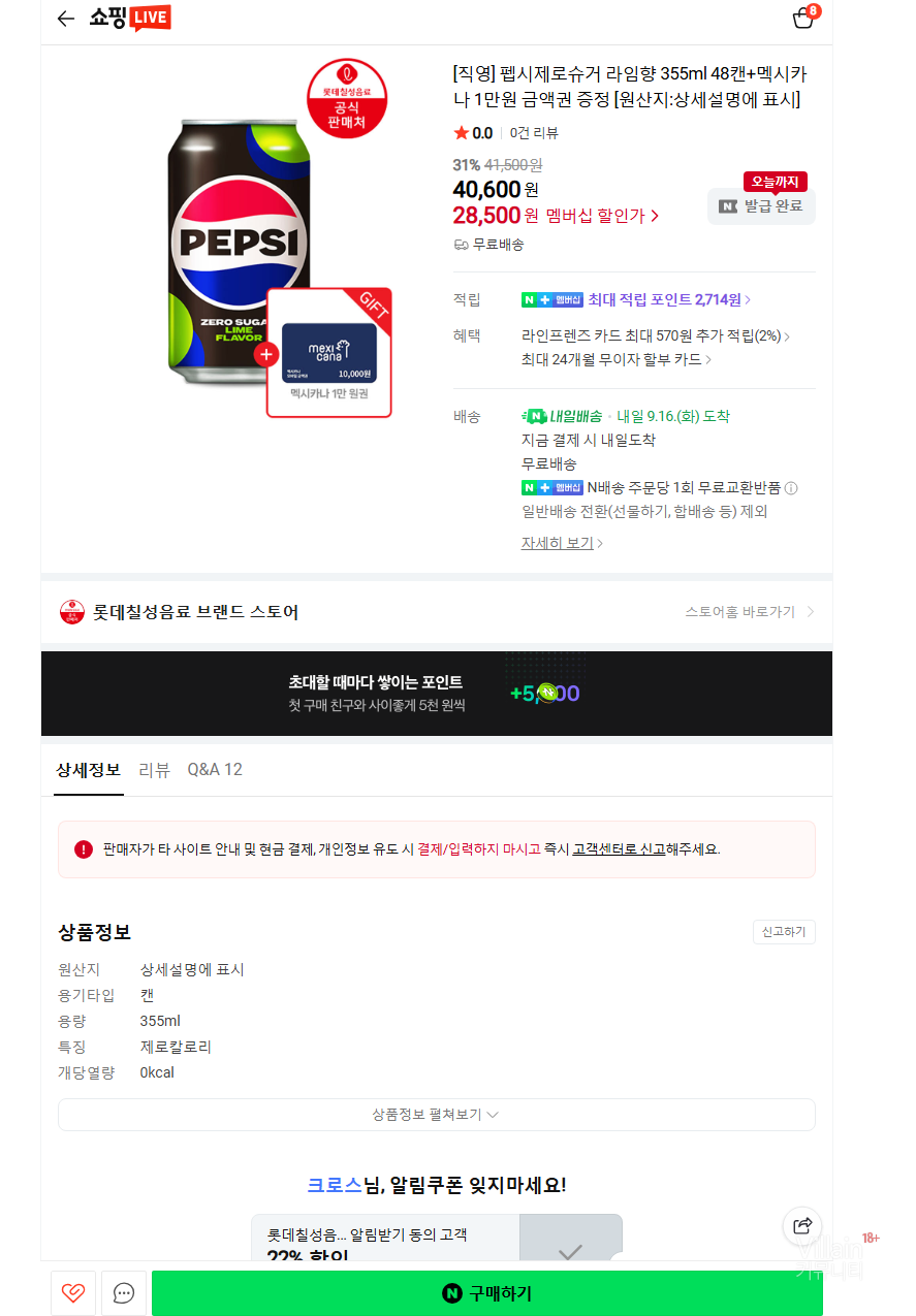 펩시 제로 355ml 48캔 + 멕시카나 1만원권