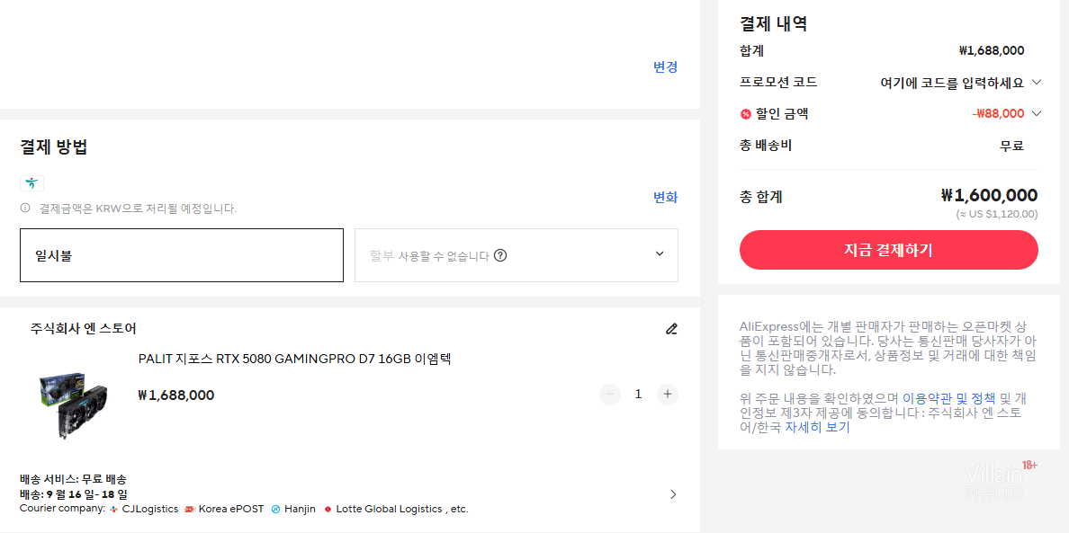 국민카드 18000원 할인 받으면 1582000원나오고, 나머지 수단으로는 1600000원 나옵니다.