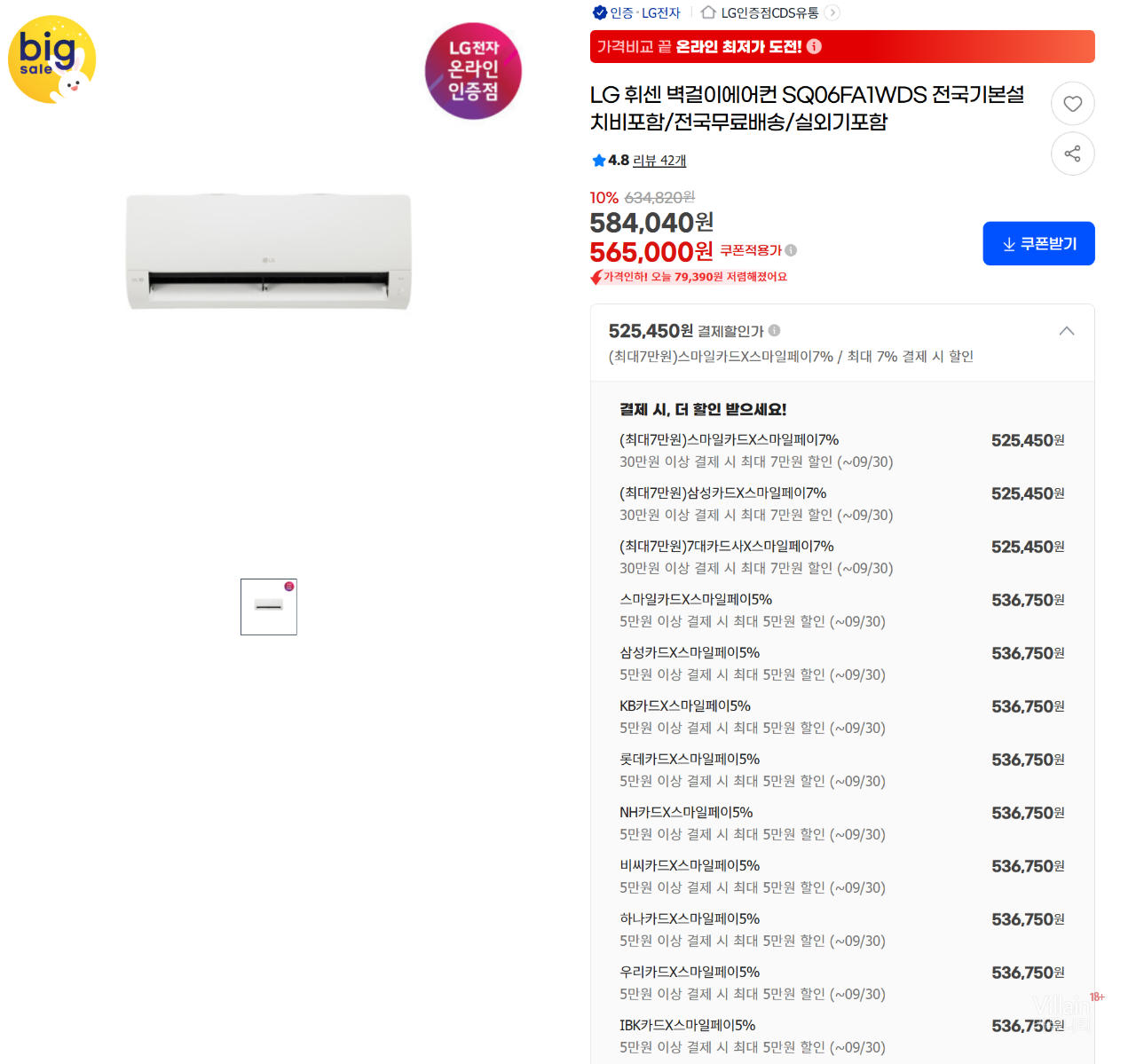 쿠폰 + 각종카드 할인가 525,450