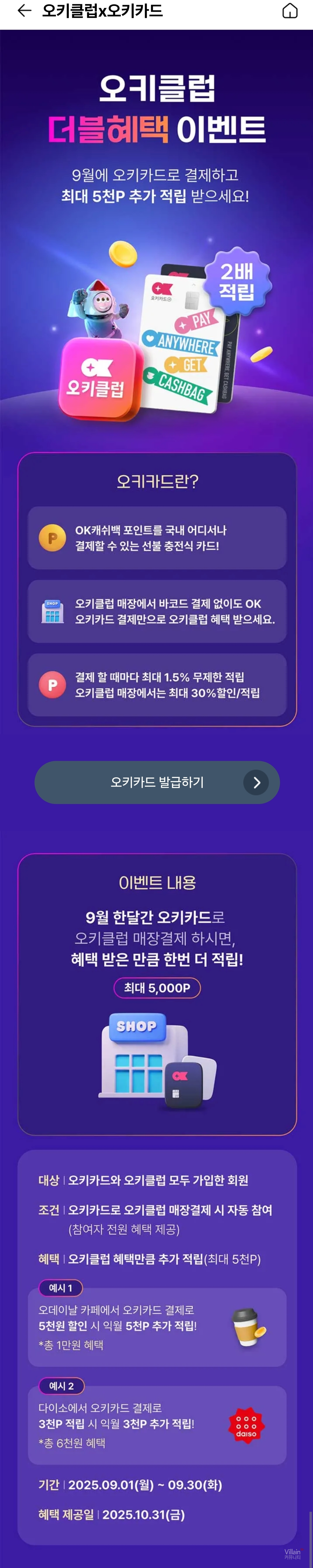 오키카드로 오키클럽 혜택을 받을경우 받은 혜택만큼 9월 한달동안 다시 적립해줍니다. 최대 5000p까지 해주구요.
