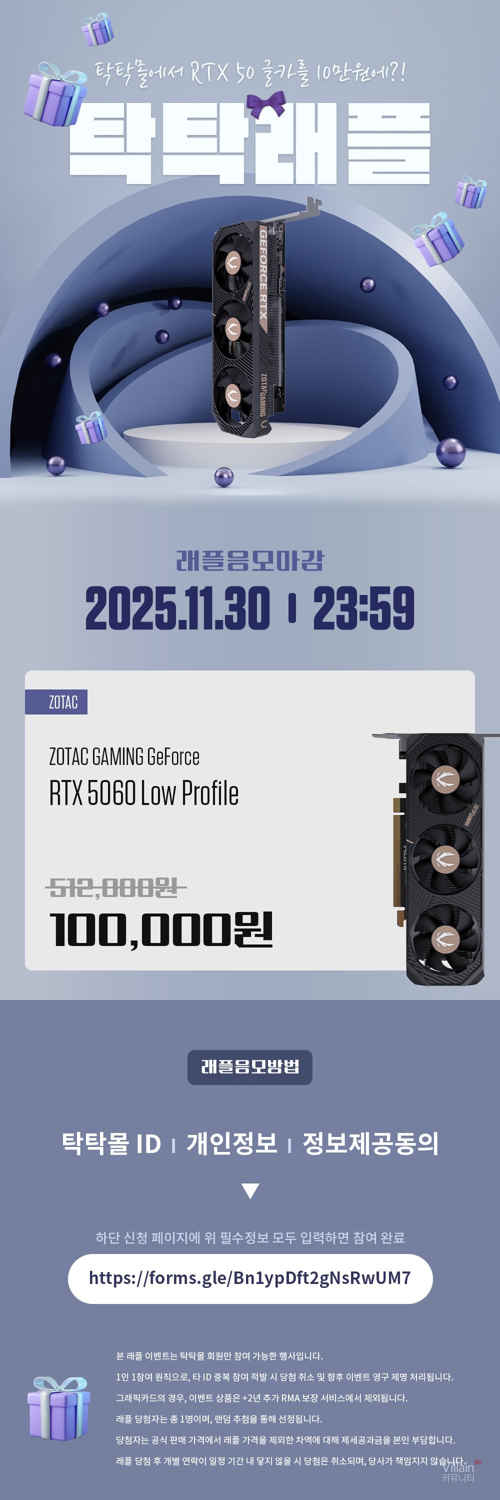 추첨을 통해 선정된 1인은 ‘ZOTAC GAMING 지포스 RTX 5060 LP 8GB’ 를 판매가 512,000원보다 훨씬 저렴한 100,000원에 구매할 수 있는 기회를 제공한다. 단, 차액에 대한 제세공과금은 당첨자 본인 부담이다.