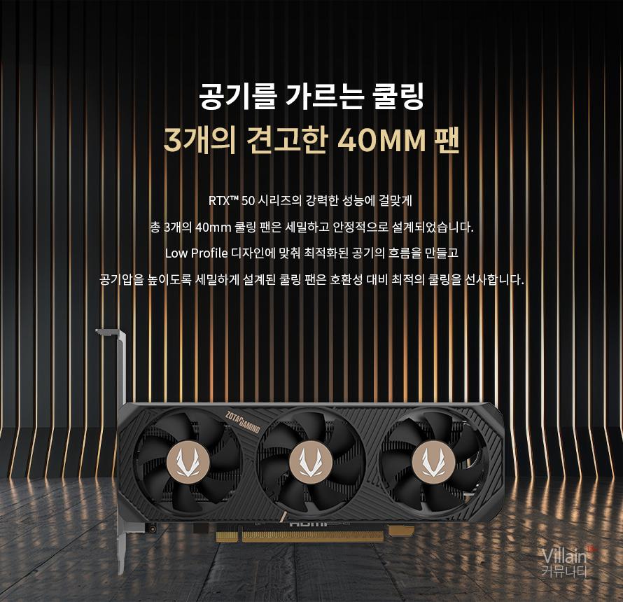 40mm 트리플 팬과 그래픽카드 전체를 덮는 고품질 히트싱크효율적인 열 분산 구조와 구리 히트 파이프를 적용해 작은 크기에서도 최상의 쿨링 성능을 발휘한다또한 내구성과 저소음 설계까지 고려해 제품 완성도를 한층 높였다.
