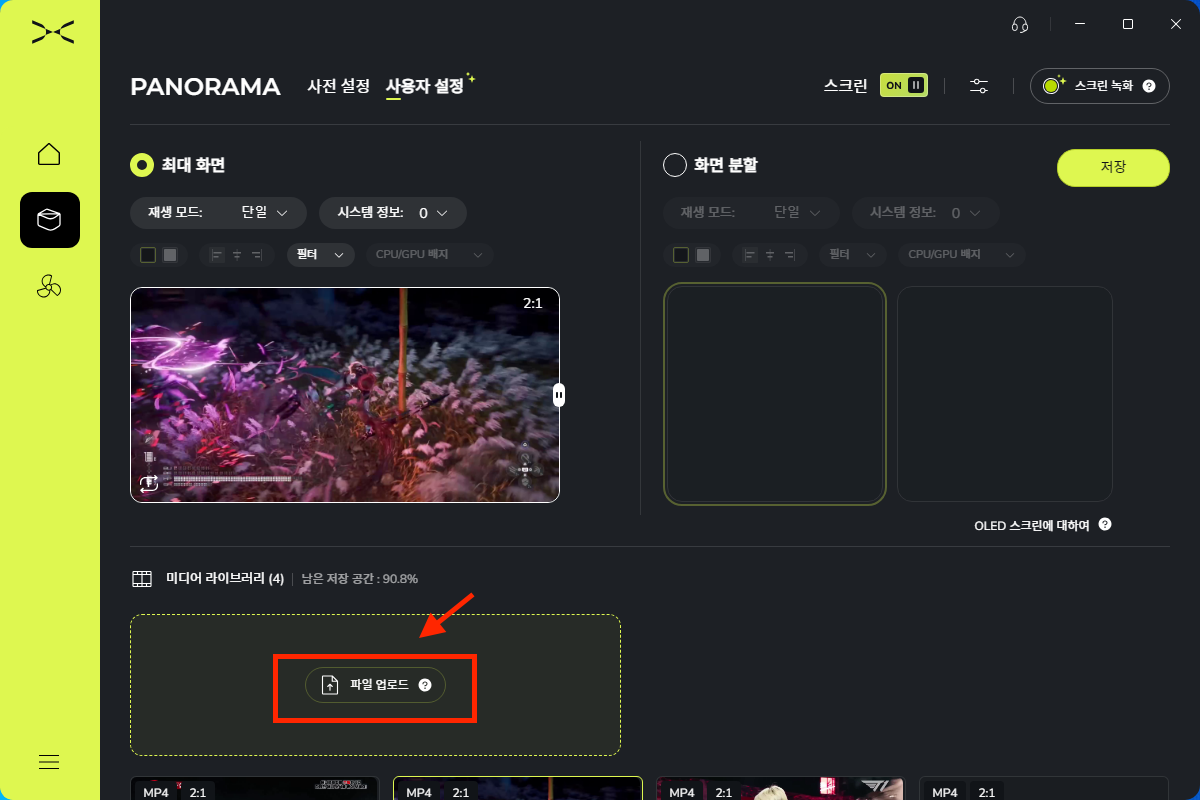 ‘사용자 설정’의 경우 사용자가 직접 촬영한 영상이나 이미지(PNG, JPG, MP4, AVI, GIF), 혹은 다운로드 받은 영상을 간단한 인코딩을 통해(사용자 시스템 성능에 따라 인코딩 시간은 차이가 있음) 원하는 비율(2:1, 4:3, 3:2, 16:9, 1:1)로 출력이 가능합니다.