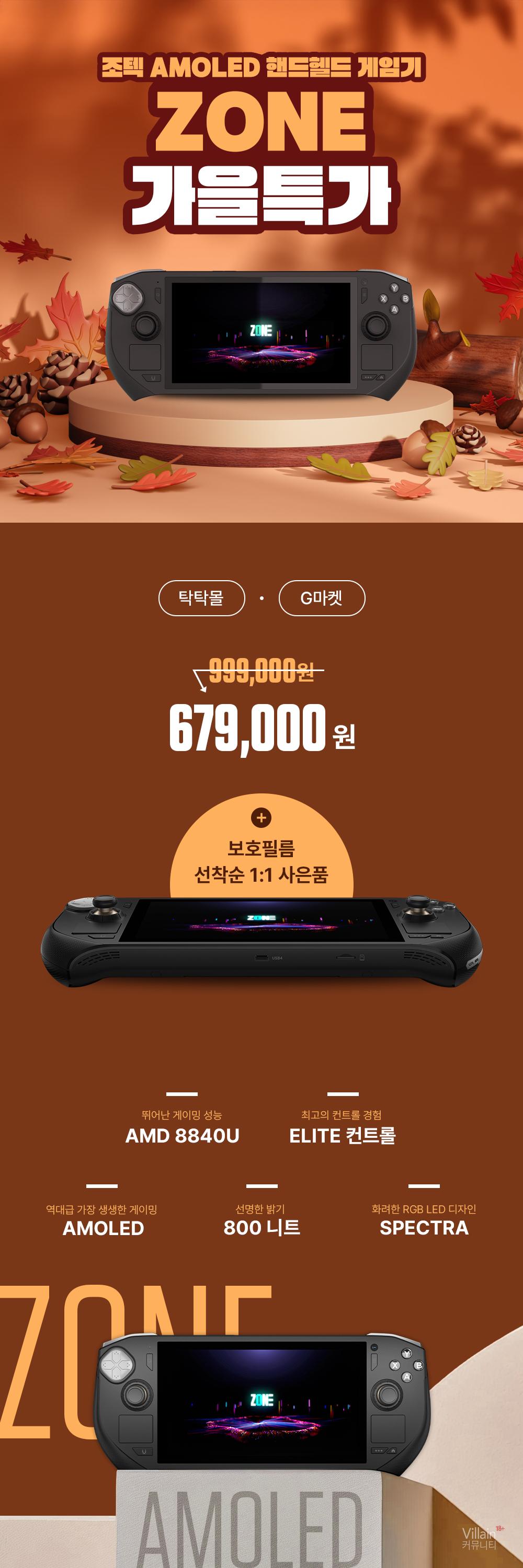 가을맞이 할인 이벤트에서 만나볼 수 있는 ‘ZOTAC GAMING ZONE’ 핸드헬드 PC는 언제, 어디서나 프리미엄 게이밍 성능과 생생한 OLED 디스플레이, 세밀한 컨트롤이 가능한 조텍의 핸드헬드 PC이다. AMD Ryzen™ 7 8840U 프로세서와 RDNA™ 3 그래픽 아키텍처를 기반으로 한 고성능 핸드헬드 게이밍 PC ZONE은 7인치 FHD AMOLED 디스플레이는 최대 800니트 밝기와 120Hz 주사율을 지원해, 선명한 화면과 부드러운 게이밍 경험을 제공한다.