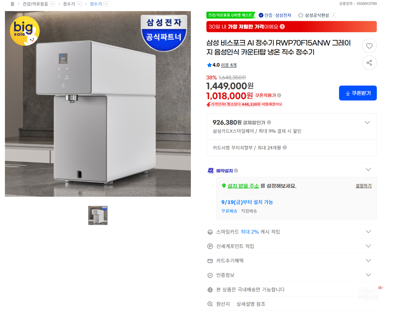 삼성 비스포크 AI 정수기 RWP70F15ANW – 926,380원