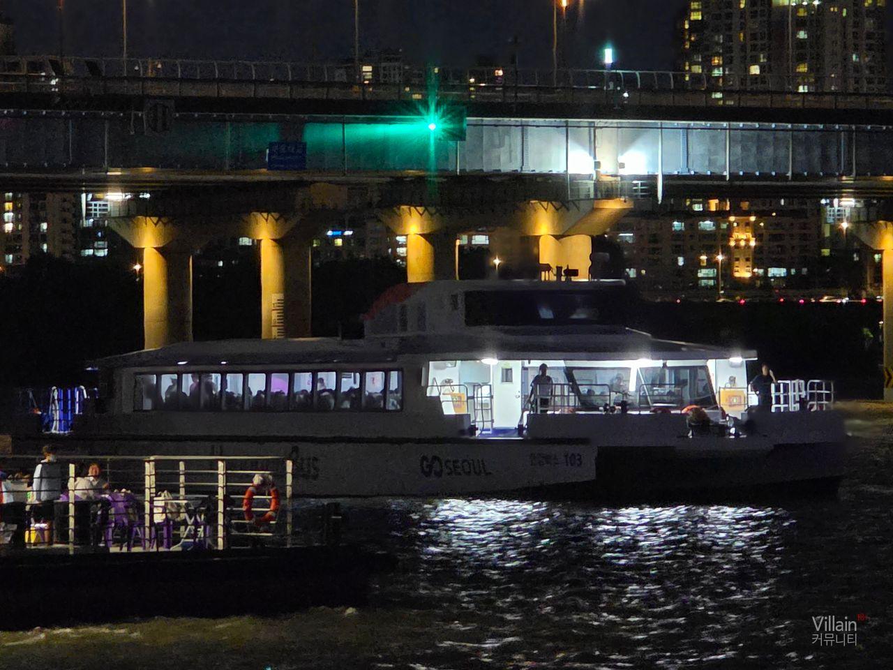 그렇게 한참 서있다 보니 갑자기 실내 조명이 잠깐 꺼졌습니다창가를 통해 서울 야경이 너무도 잘 보입니다모두들 탄성을 지릅니다우와멋져저도 창가 자리 잘 잡았네 하면서 흐뭇해 하는 순간 바로 불이 켜집니다잘못 조명을 껐던 거죠그러니까 이건 유람선이 아니라 한강 버스입니다. 대중교통 수단이니까 그런 유람선이 할 법한 일은 안 합니다아쉽지만 어쩔 수 없습니다.
