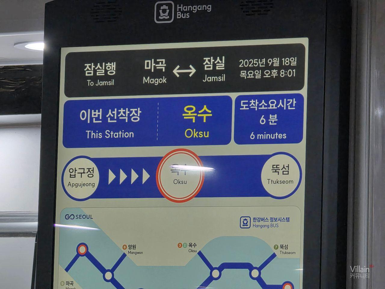 아무튼 자리로 돌아와서 앉으니 전광판에 다음 선착장까지 남은 시간이 나옵니다. 예를 들면 여의도에서 탑승 시 압구정 선착장까지 남은 시간이 나오고그 다음에는 압구정에서 옥수로 이동할 때 선착장까지 남은 시간이 나온다는 거죠이런 것만 보면 꼭 버스 같습니다그런데… 이걸 곧이곧대로 믿으면 안 됩니다.