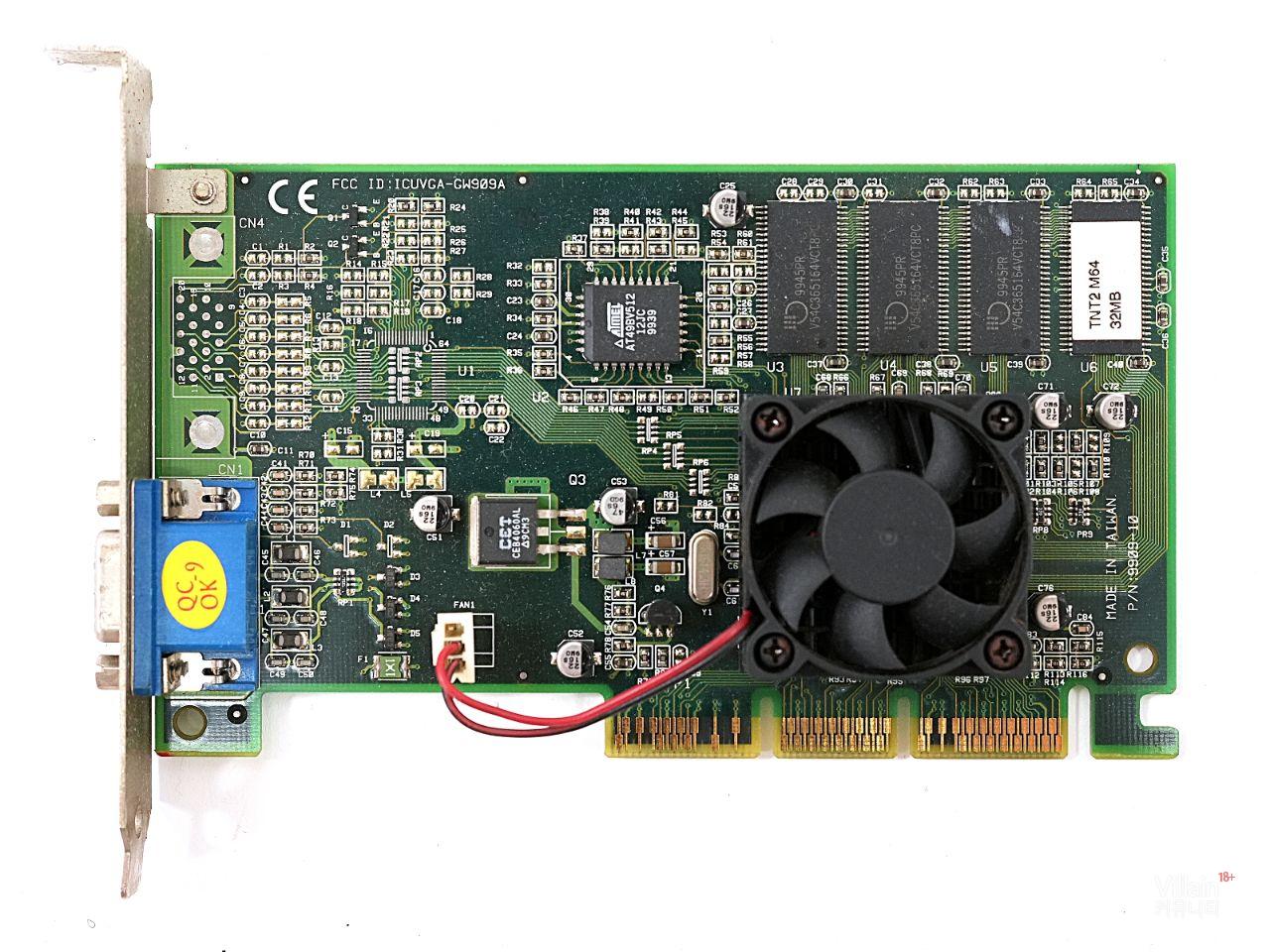 ** 사진의 제품은 M64 보급형 제품으로 원래 TNT2가 128bit 메모리 버스를 쓰는데, M64는 이를 절반(64bit)으로 줄여 원가 절감한 모델입니다. 즉 99년도에 PC방에 대량으로 싼마이로 납품을 목적으로 생산된 그래픽카드죠. 98년도 스타크래프트가 나왔고, 99년도에는 스타크래프트를 위한 PC방이 하나의 흐름이 되었습니다. 그래픽카드 진화에 PC의 역사가 서려있죠.