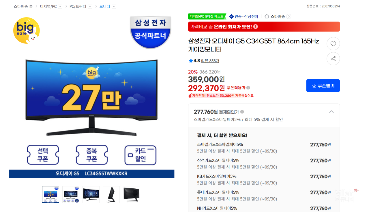 기존 핫딜 30만원대였는데 277,760원 나오네요 역대급가격입니다
