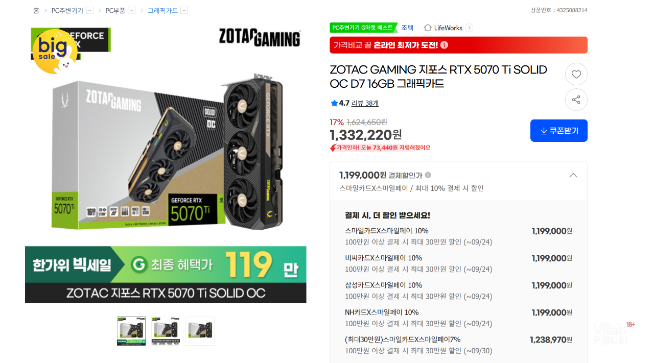 ZOTAC GAMING 지포스 RTX 5070 Ti SOLID OC D7 16GB 그래픽카드 (119.9만) +보더랜드4(오늘까지)