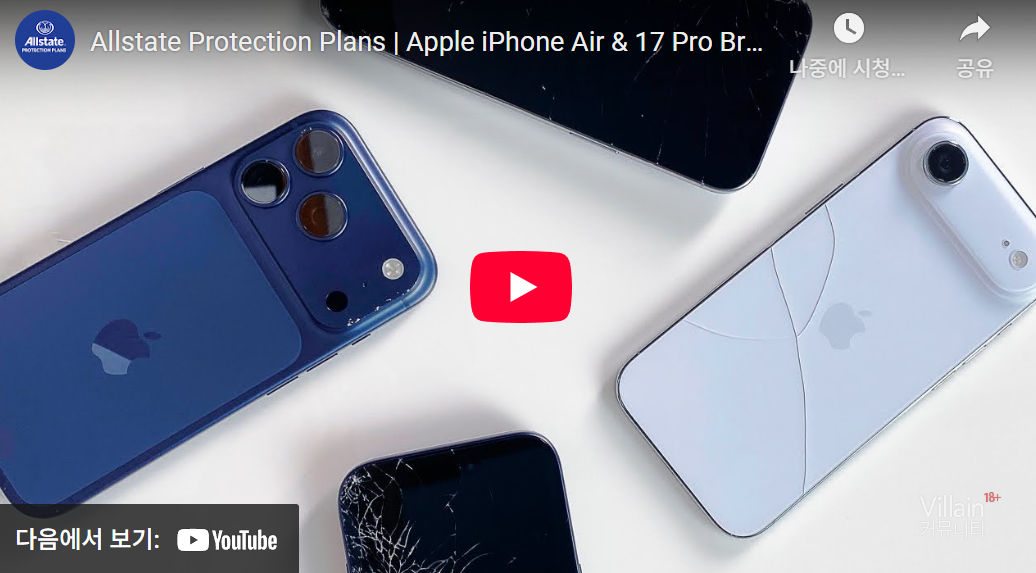 올스테이트는 과거 ‘침수 테스트’도 진행했지만, 최근 아이폰 모델은 방수 성능이 크게 향상돼 더 이상 의미가 없다고 밝혔다. 아이폰 17 프로와 아이폰 에어는 모두 IP68 등급의 방수·방진 성능을 갖췄으며, 최대 30분 동안 수심 19피트(약 6m)에서 견딜 수 있다.
