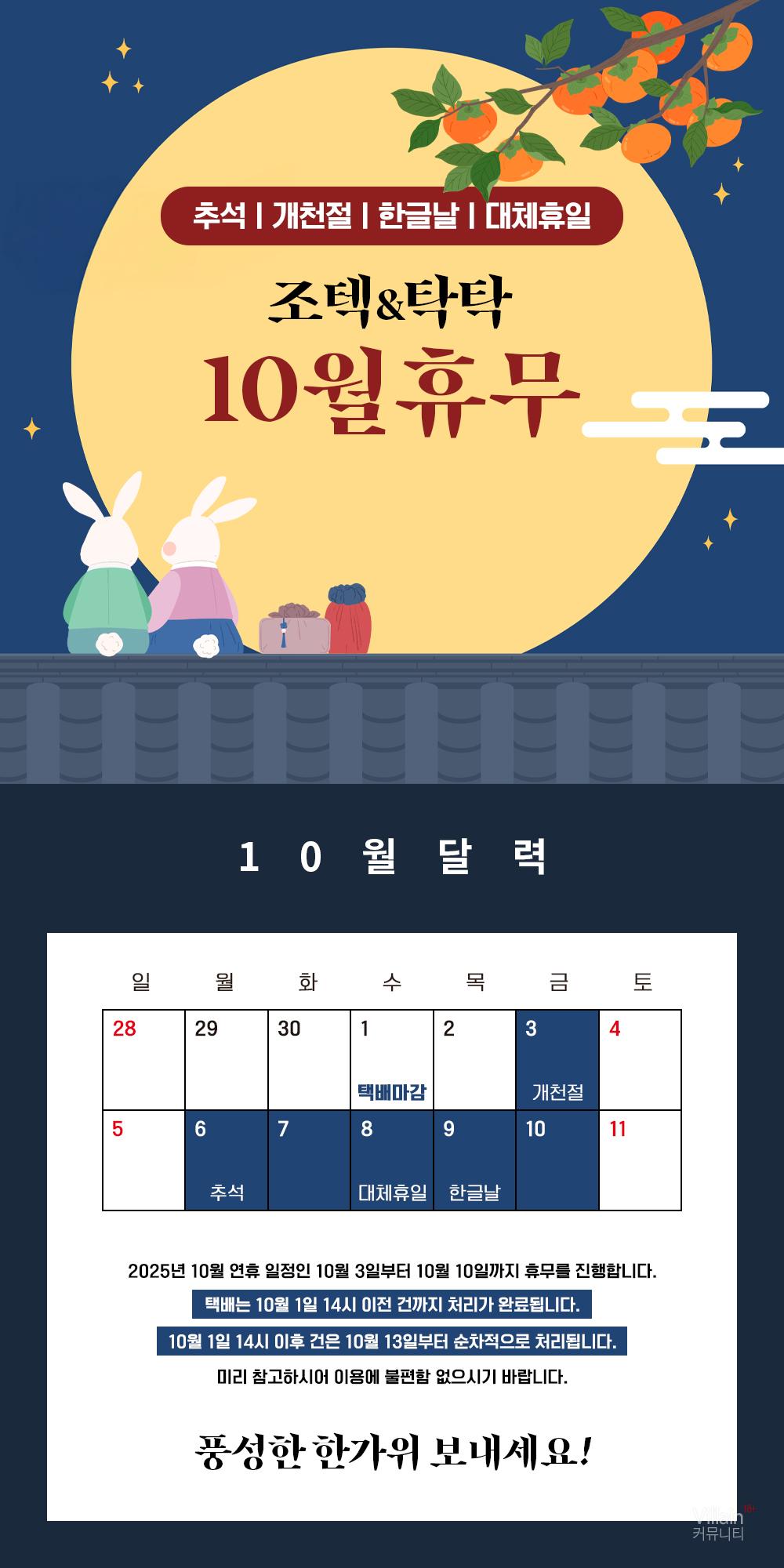 추석인 관계로 택배 접수가 10월 1일 오후 2시 마감 되오니 참고 부탁 드립니다.
