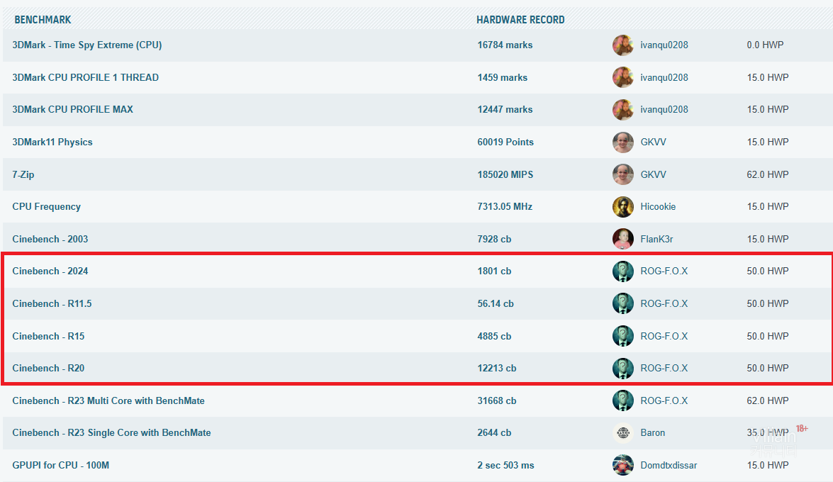 ASUS의 매니저 토니는 라이젠 9000 프로세서와 이 메인보드를 조합해 무려 12개의 ‘세계 기록’을 달성했다. @unikoshardware의 보도에 따르면, 토니는 라이젠 9800X3D, 라이젠 9700X, 라이젠 9900X3D를 활용해 여러 시네벤치 테스트에서 최고 점수를 기록했다. 액체 질소 냉각을 적용해, 특히 라이젠 9800X3D 기준으로 Cinebench R23, R20, R15, R11.5, 그리고 2024에서 최고 점수를 보유하게 되었다.