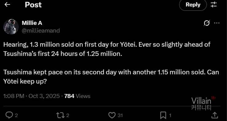 인사이더 밀리어맨드(Millieamand)에 따르면, ‘고스트 오브 요테이(Ghost of Yotei)’는 출시 첫날에만 130만 장을 판매했으며, 이는 125만 장을 기록했던 ‘고스트 오브 쓰시마(Ghost of Tsushima)’를 앞서는 수치다. 장기적으로 이 상승세를 유지할 수 있을지는 지켜봐야 한다.