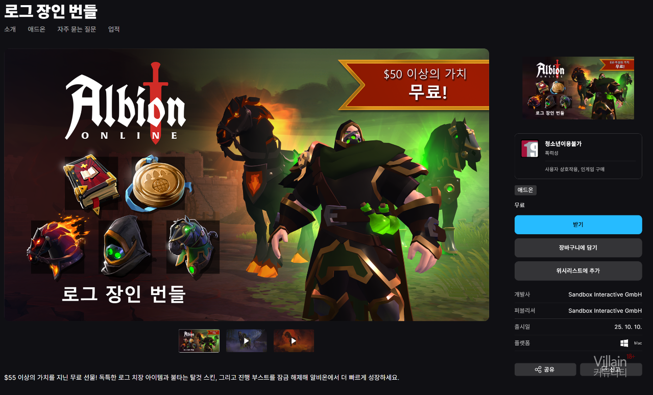 먼저 기본 게임 **Albion Online**을 라이브러리에 추가한 뒤,추가로 **Rogue Journeyman 번들**을 등록하세요.