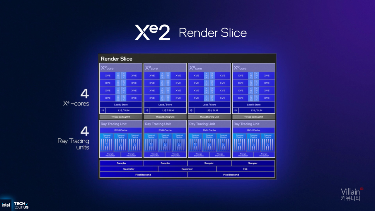 기존 Xe2는 렌더 슬라이스당 4개의 Xe 코어와 4개의 레이 트레이싱(RT) 유닛으로 구성되어 있었다.