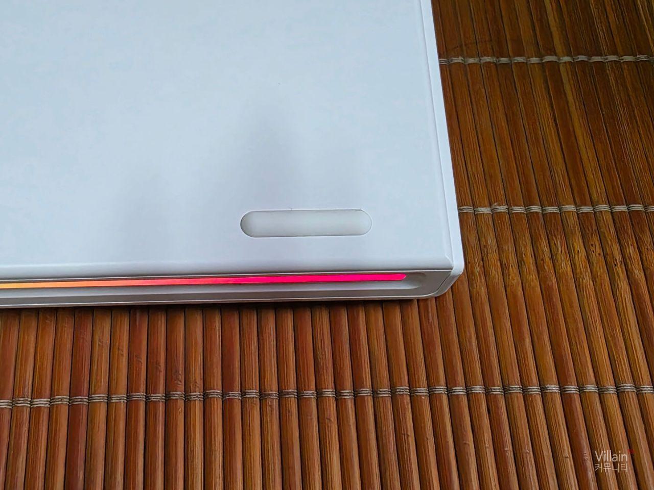 제품의 모습입니다. 전면에는 LED로 상태를 볼 수 있는 창과 제품의 연결방식을 바꿔주는 스위치가 있으며 뒤쪽에는 제품지지대와 케이블을 연결할 수 있는 C타입의 연결부가 있습니다.