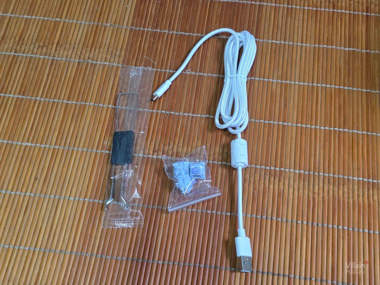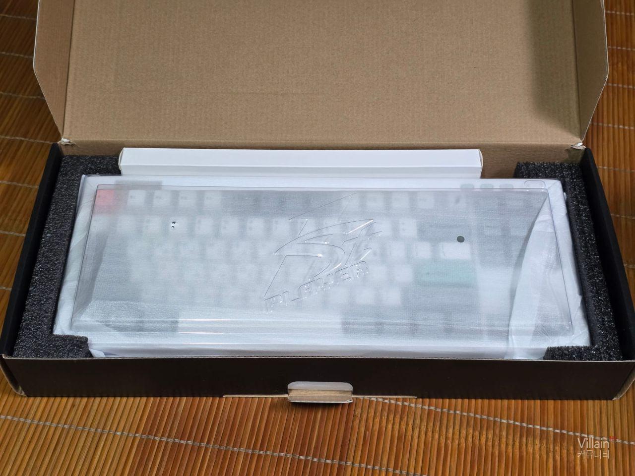 제품의 포장과 구성입니다. 박스안에서 스티로폼과 플라스틱으로 제품을 단단히 고정하고 있습니다. 제품의 구성은 키보드 , 설명서 , 키캡 , 여분스위치에 연결케이블로 되어 있습니다.