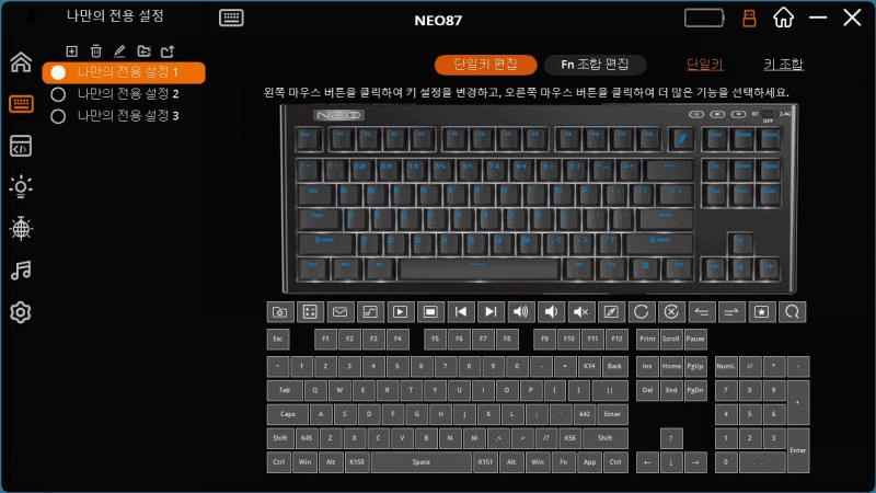 키보드에서 지원하는 전용프로그램으로 나에게 맞게 제품설정이 가능한걸 알 수 있습니다.