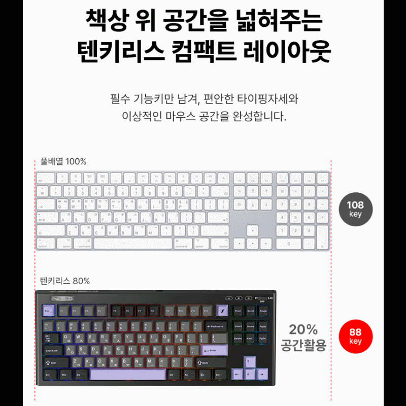이렇게 1stPlayer NEO87 유무선 기계식 (레트로) 제품의 체험단을 해봤습니다. 우선 제품의 포장이 단단하게 고정이 가능해서 무척 마음에 들었고 구성은 필요한것만 있다고 생각합니다. 제품외적인것으로는 무선을 지원하는 제품이고 87키 제품이라 자리를 적게 차지해 내가 원하는 위치에 두는게 좋고 걸리적거리지 않는게 좋았습니다. 그리고 배터리가 있어서 일반 108키 유선제품보다 묵직하게 안정감이 있는게 좋습니다. 제품자체 키감도 좋은편이고 프로그램으로 개인설정이 가능한것도 좋습니다. 아쉬운점은 모든 87키제품은 숫자키가 없어서 숫자를 많이 사용하는 환경에서는 쓰기 불편한건 아쉽습니다. 제품무게도 괜찮고 키감도 좋은편에 다양한 무선을 지원하는 제품이라 숫자키 사용이 상관없는 환경에서는 추천할 수 있는 제품인것 같습니다.