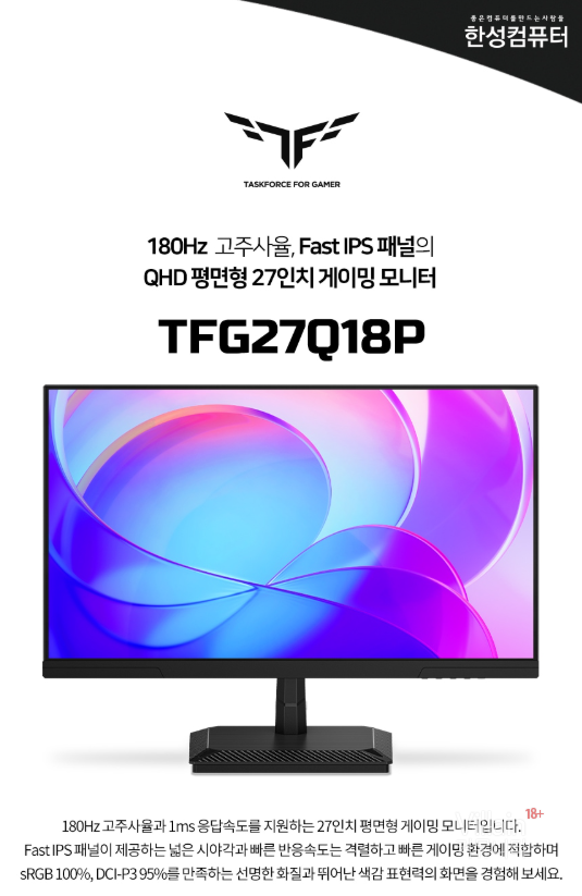 국내발송제품 한성 TFG27Q18P 27인치 Fast IPS QHD 180Hz게이밍 모니터