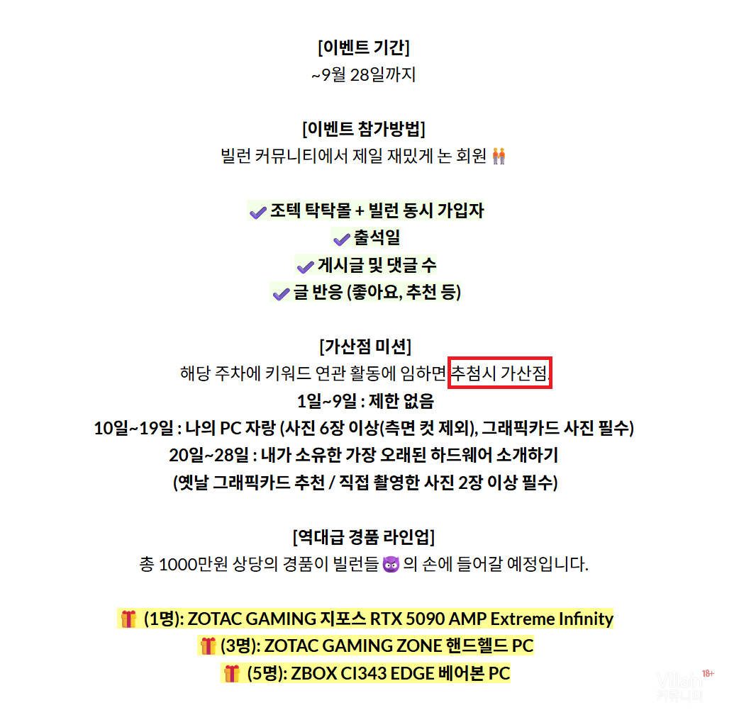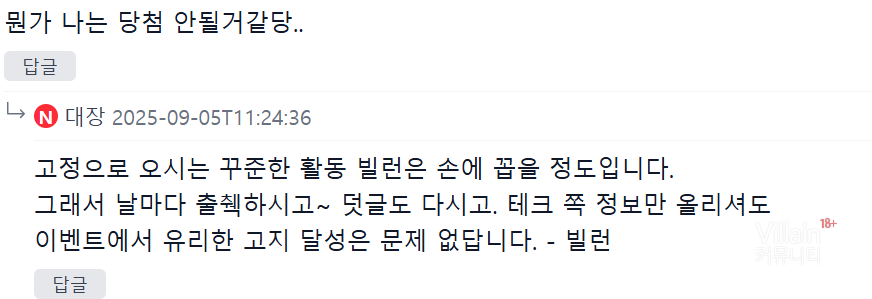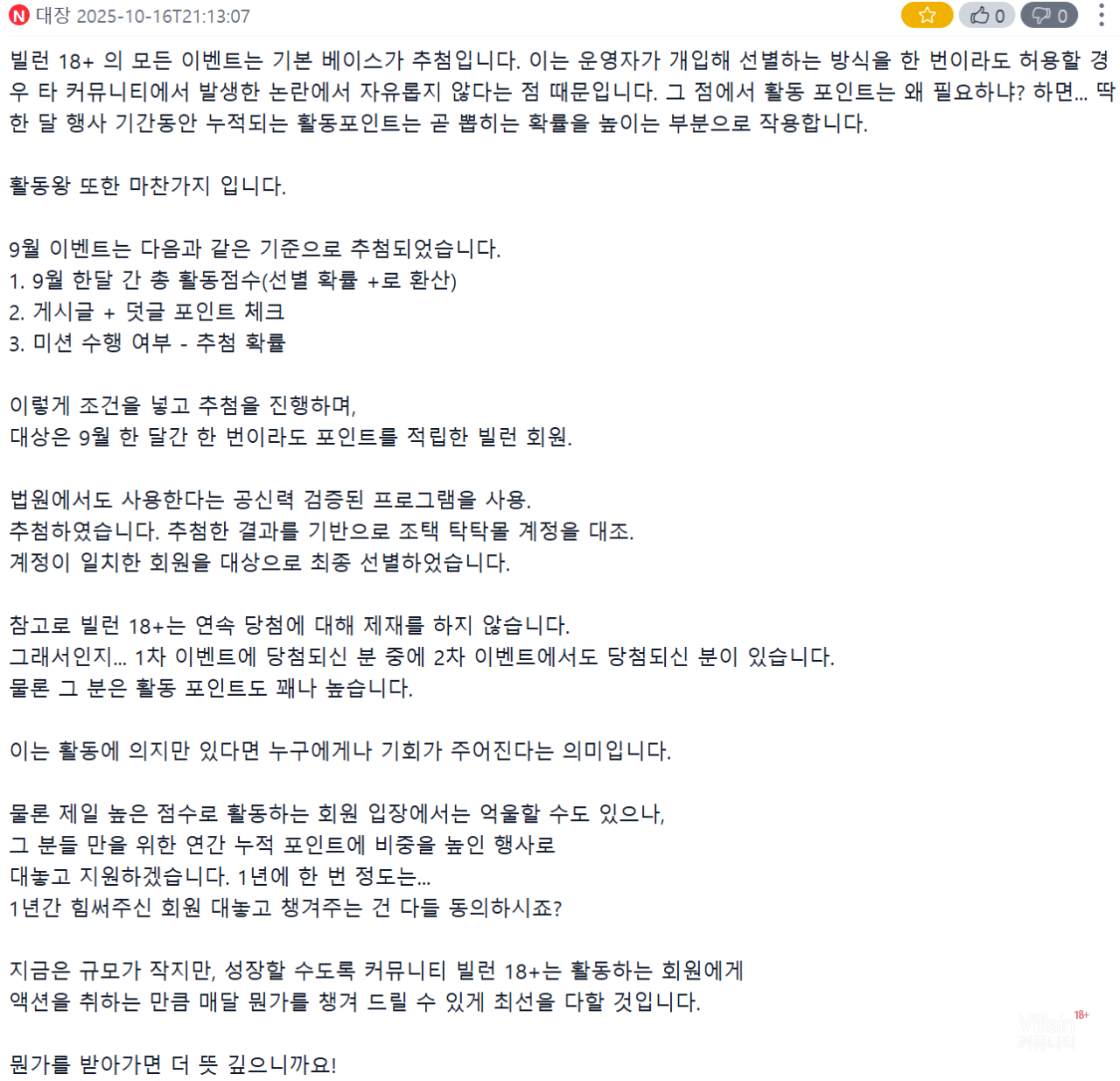 본문 명시된 부분 : 빌런 커뮤니티에서 제일 재밌게 논 회원 > 단순 무작위 추첨이 아니라 활동 내용과 반응(출석, 글, 댓글,반응 등등)