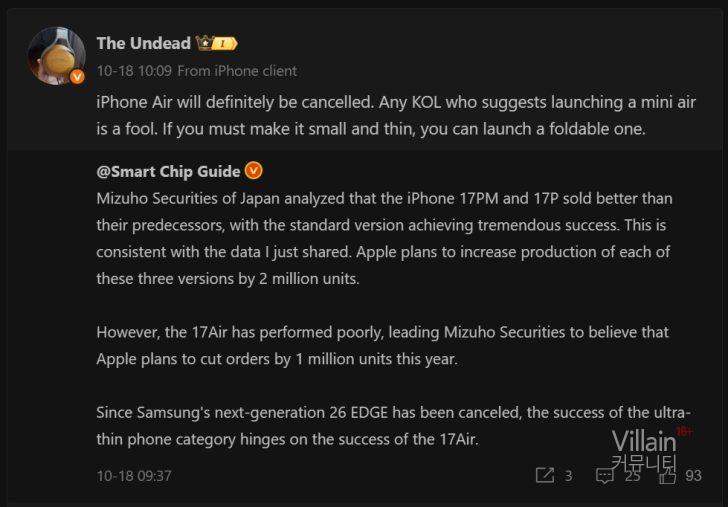 중국 SNS 웨이보(Weibo)의 팁스터 ‘The Undead’는 “아이폰 에어는 확실히 단종된다(definitely canceled)”고 주장했다. 그는 이 발언을 미즈호 보고서를 인용한 게시물에서 덧붙였으며, 동시에 다른 모델들의 생산량은 수요 증가에 따라 확대될 것이라고 밝혔다.