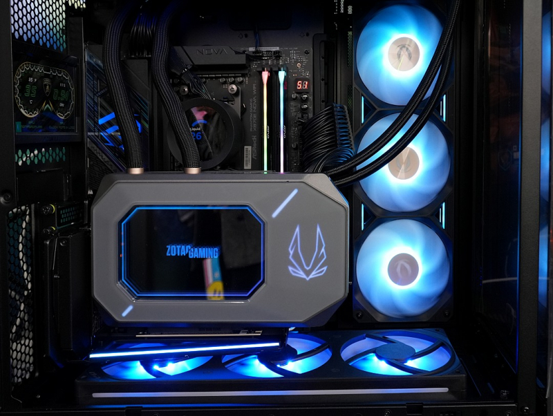 부스에 전시한 제품 포커스도 명료했다. RTX 5090 라인업 가운데 AMP Extreme Infinity와 ArcticStorm 두 모델을 앞세워, 공랭과 수냉이라는 상이한 쿨링 방식의 체감 차이를 강조했. 신 차장은 두 제품이 생김새부터 크게 다르다고 설명하면서, 하나는 일반적인 가로형 장착의 공랭 그래픽카드, 다른 하나는 워터블록을 포함한 수냉 방식이라는 점을 지적했다. 상이한 특징을 기반으로 체감할 수 있는 '외형, 장착 방식, 냉각'의 차이를 통해 같은 세대 GPU라도 사용 경험이 달라질 수 있음을 전하려는 의도가 읽힌다. ‘어떤 그래픽카드가 더 빠른가’라는 단선적 비교가 아니라, 내 PC 환경과 취향에 맞는 방식을 고르는 판단의 기준을 제공한 셈이다.