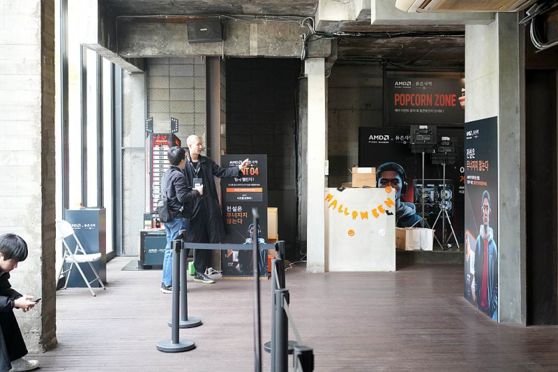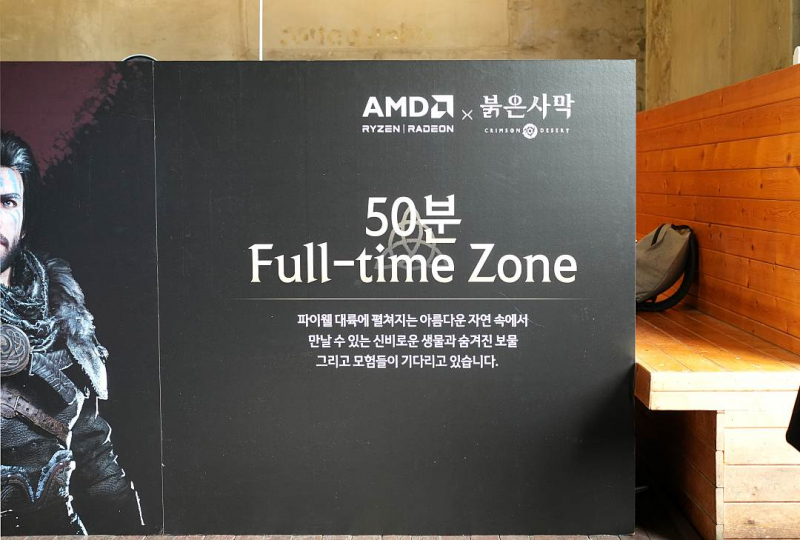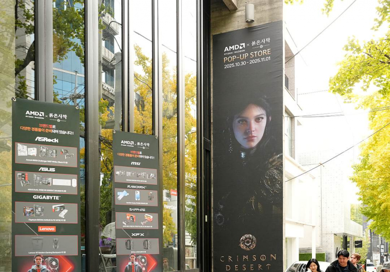 유리 파사드 너머로 연상되는 ‘체험’이라는 한 단어의 존재감이 짙은 이곳. 상설 매장이 아닌 팝업스토어다. 짧게 열고 강하게 각인시키는 것으로 목적으로 입구에서부터 안내 배너와 대기 동선, 포토 스폿으로 참관객을 이끈다. 전체적인 흐름은 “먼저 보고–손으로 만질 수 있게 했고–위로 올라가 플레이하는” 일련의 방식이다. 여기는 바로 홍대 DRC에 문을 연 ‘AMD × 붉은사막 팝업스토어 2025’ 현장이다. 게이머에게 빌드를 넉넉하게 시연하겠다는 의지를 전면에 내걸었다. 유일한 단점이라면 운영 기간이 짧다. 그래서 더 임팩트있게 구성했다.