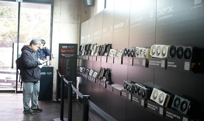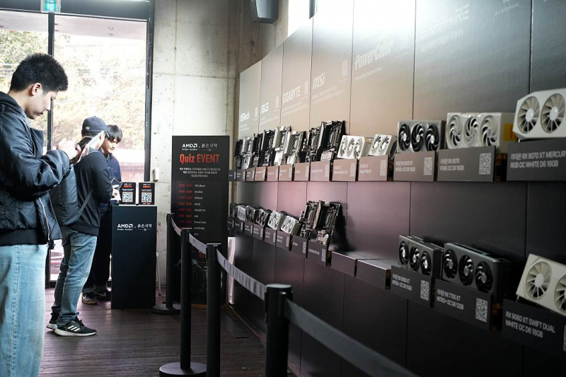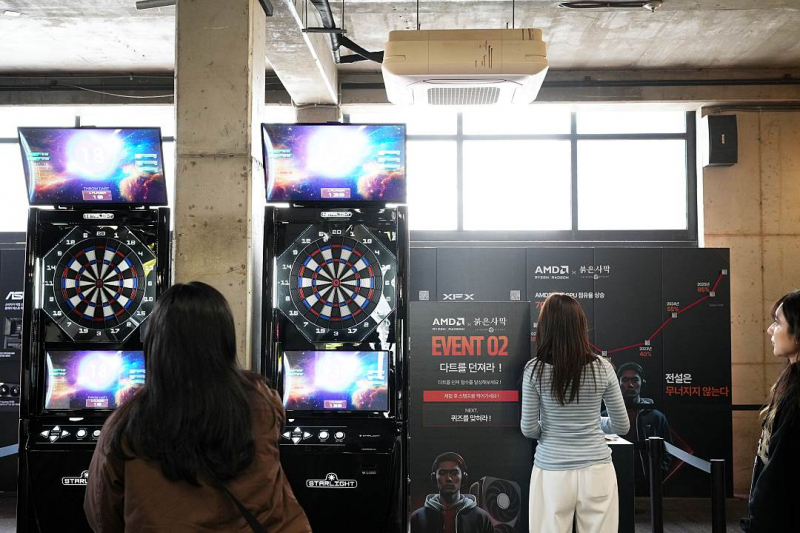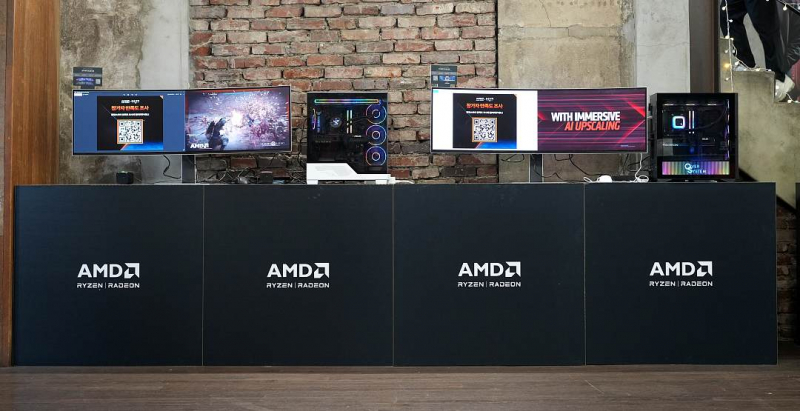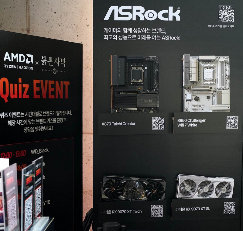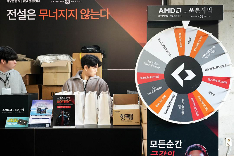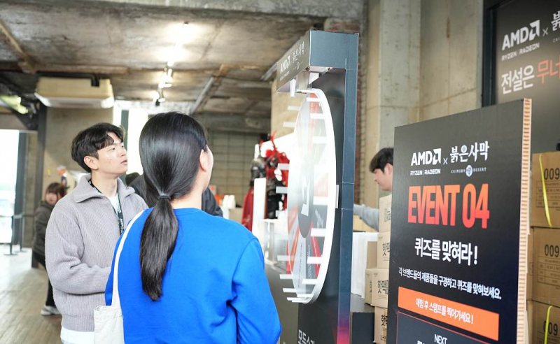중앙 이벤트 라인은 “CPU는 라이젠, 그래픽은 라데온”이라는 메시지를 체험과 연결했다. 다트·룰렛·퀴즈 미션을 통과하면 스탬프를 찍어 굿즈를 받는 형식인데, 퀴즈 문항 상당수가 “어떤 메인보드가 어떤 라이젠을 지원하나, 어느 벤더의 라데온 카드가 무엇을 특징으로 하나”처럼 전시 패널과 데모 PC를 직접 보고 답할 수 있게 디자인했다. 현장 배너엔 특정 제조사 로고도 함께 배치해, 보드 4사와 라데온 AIB(애드인보드) 파트너가 AMD 생태계라는 한 프레임 안에 묶는 등 좁은 공간에서 최대한 다양한 브랜드를 엮기 위한 나름의 고심이 엿보였다.