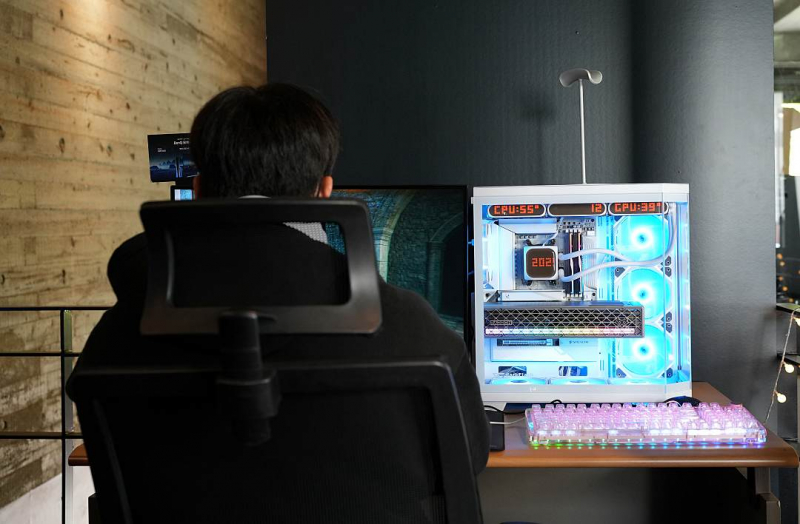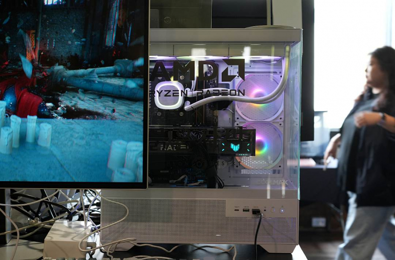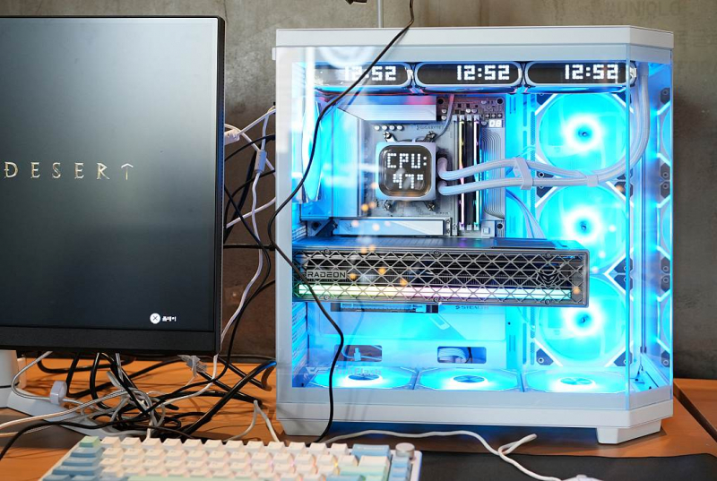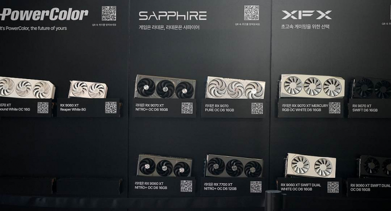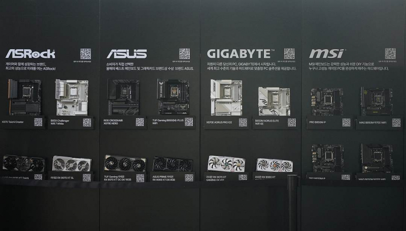 그 중 홍대 DRC 1층 안쪽 벽면은 통째로 AMD 파트너 벤더 전시로 채워졌다. 좌측부터 ASRock–ASUS–GIGABYTE–MSI–PowerColor 순으로 보드와 라데온(Radeon) 그래픽카드가 브랜드별 패널에 나란히 붙었고, 각 제품 아래엔 QR 코드가 붙어 있어 스펙·지원 칩셋을 바로 확인할 수 있게 했다. 벽면 뒤편 통로에는 이들 부품으로 조립한 완본체 데모 PC가 줄을 섰다. 화이트 섀시에 수랭쿨러와 RGB 팬을 넣고 라이젠(Ryzen) + 라데온 조합을 구성한 시스템이 대표적이었고, 투명 강화유리 사이드 패널을 통해 그래픽카드 길이·전원 구성·케이블 루팅까지 눈으로 점검할 수 있었다.