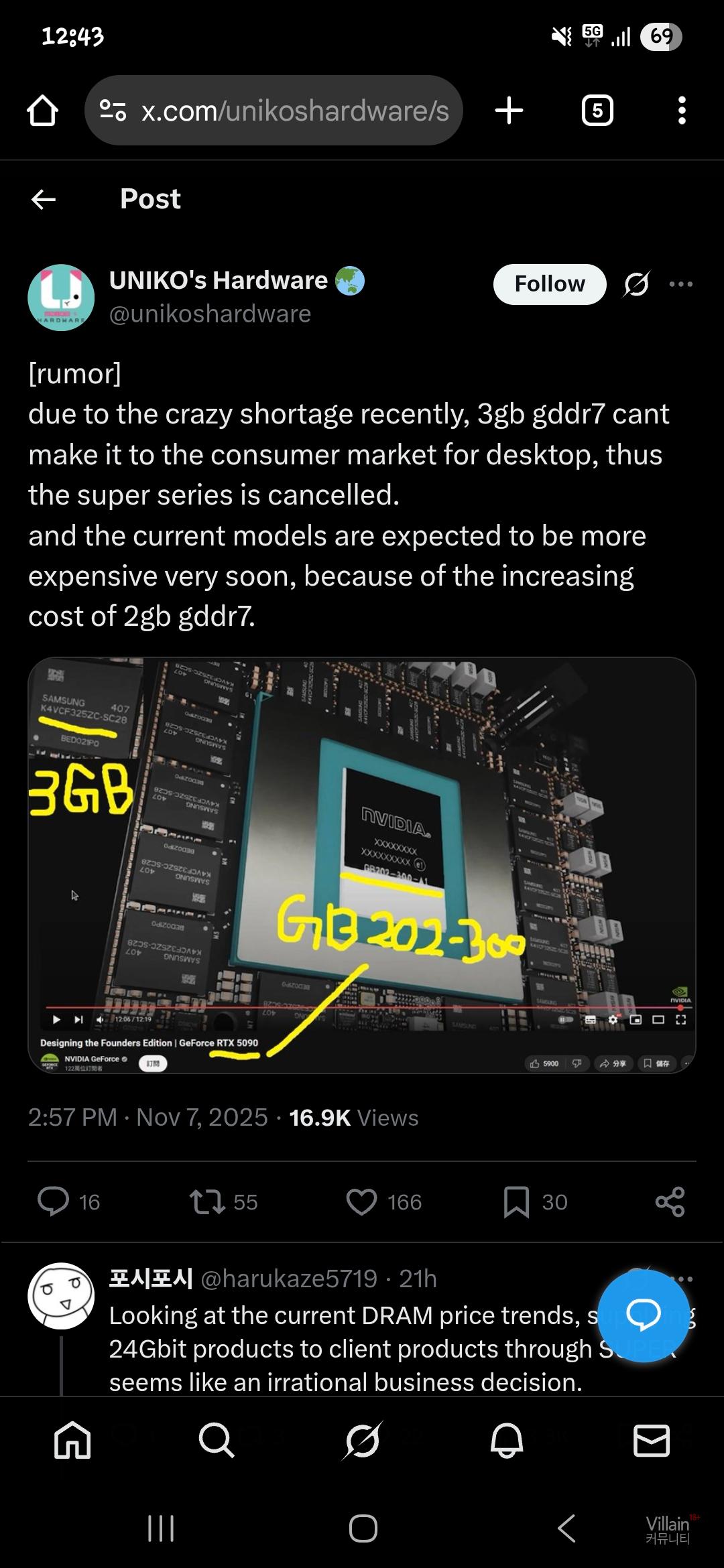 최근 엄청난 품귀 현상으로 인해 3GB GDDR7이 데스크톱용 소비자 시장에 출시되지 못해 슈퍼 시리즈가 취소되었습니다.