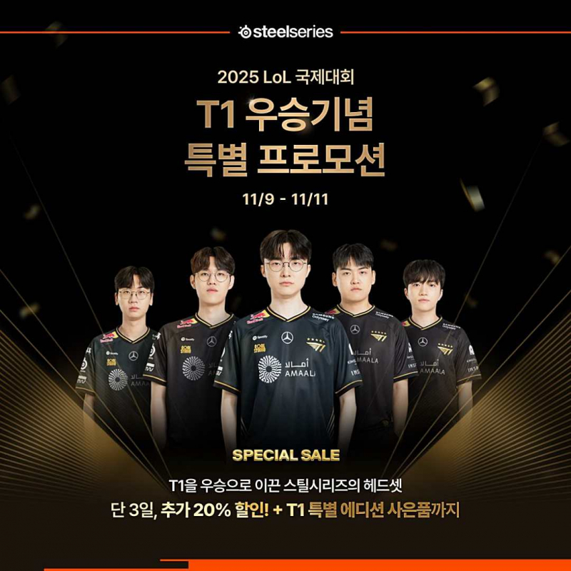 게이밍 기어 브랜드 스틸시리즈(SteelSeries)가 공식 파트너 팀 T1의 ‘2025 LoL 국제대회’ 우승을 기념해 특별 프로모션을 실시한다. 11월 9일부터 11일까지 3일간 네이버 스틸시리즈 공식스토어에서 진행된다.