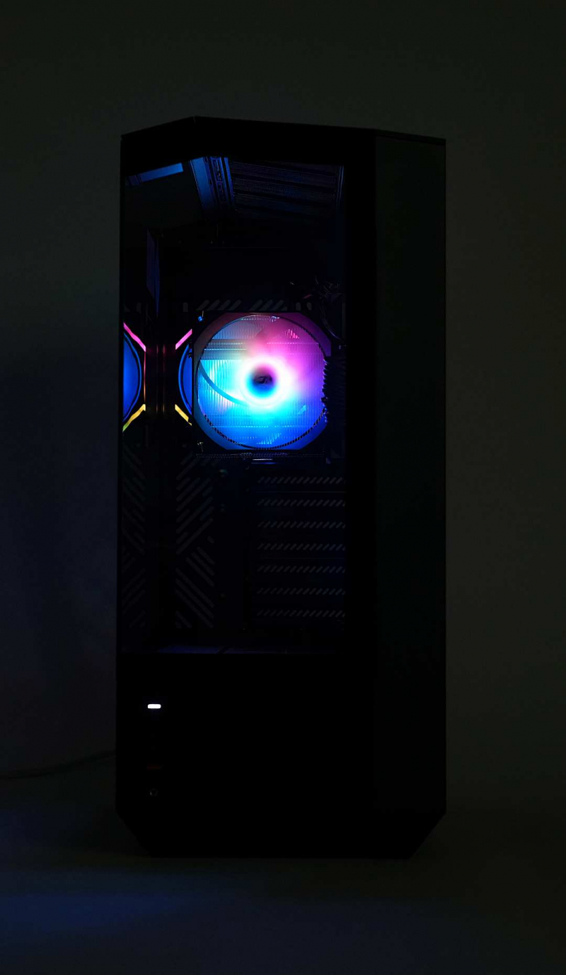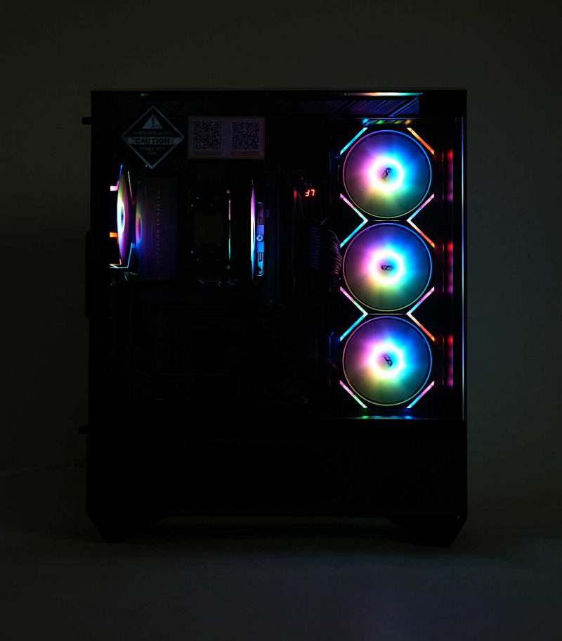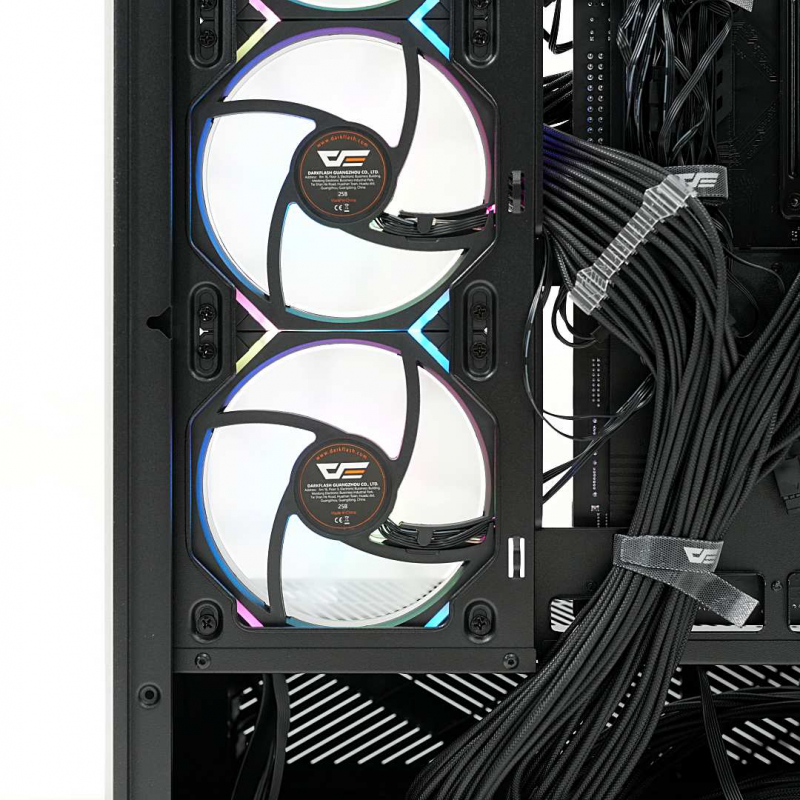 DY460은 최신 트렌드인 ARGB 120mm 쿨링팬 4개를 기본 제공한다. 측면에 배치된 3개의 팬은 역방향 블레이드 방식으로 설계되어, 팬을 뒤집지 않고도 흡기 방향을 유지하면서 시각적 일관성을 확보한다. 데이지 체인 연결 방식을 지원해 케이블 정리가 간편하며, 우측 패널의 미세 메쉬 에어홀과 결합해 흡기 효율을 높인다.