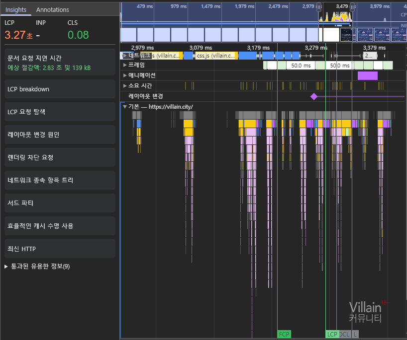 빌런 메인페이지 갱신되는 데에 3,215.7 ms 약 3.2초 정도의 지연시간이 발생되고 있습니다.