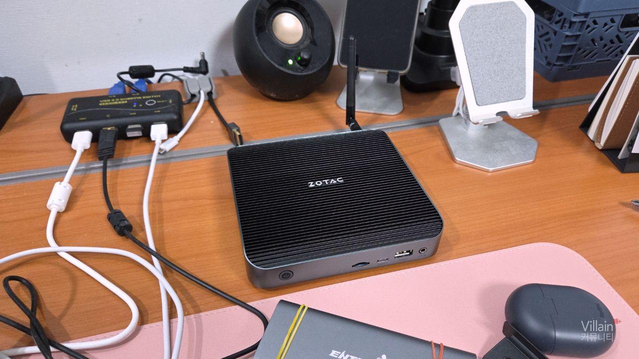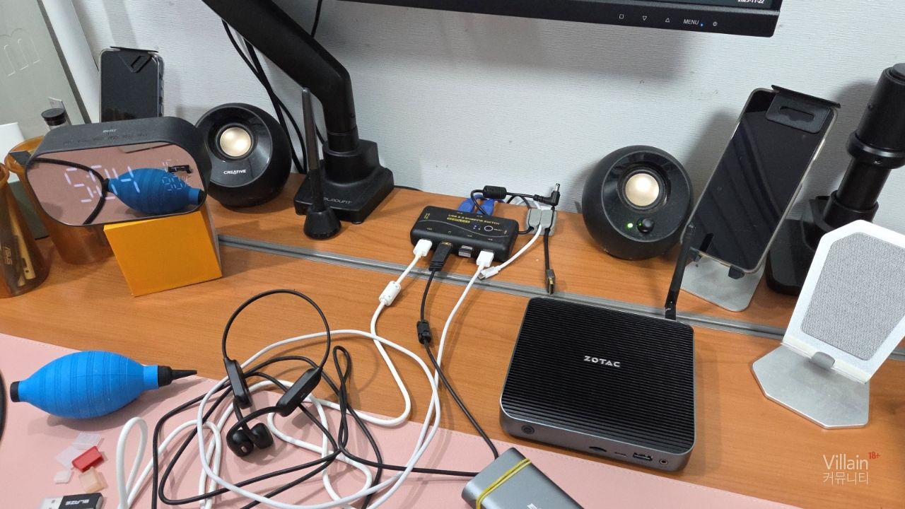 혼외자 홍길동 미니 PC의 전원과 모니터를 연결하기 위해서 책상 뒤에서