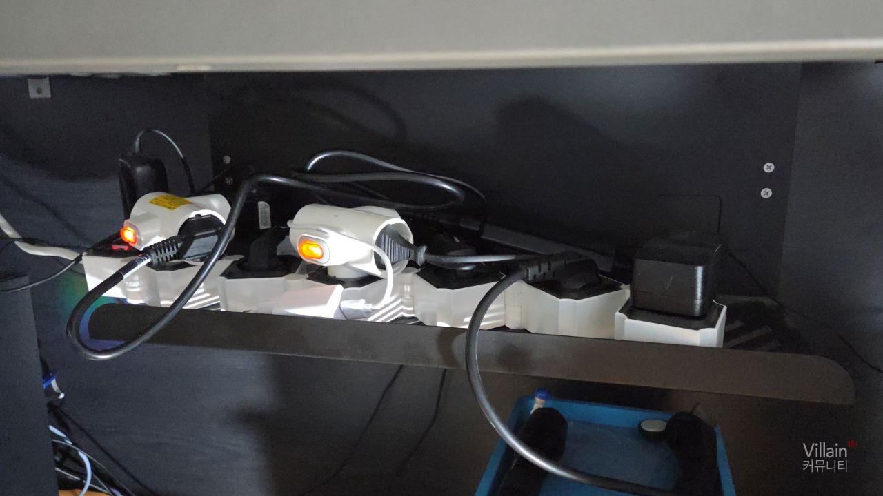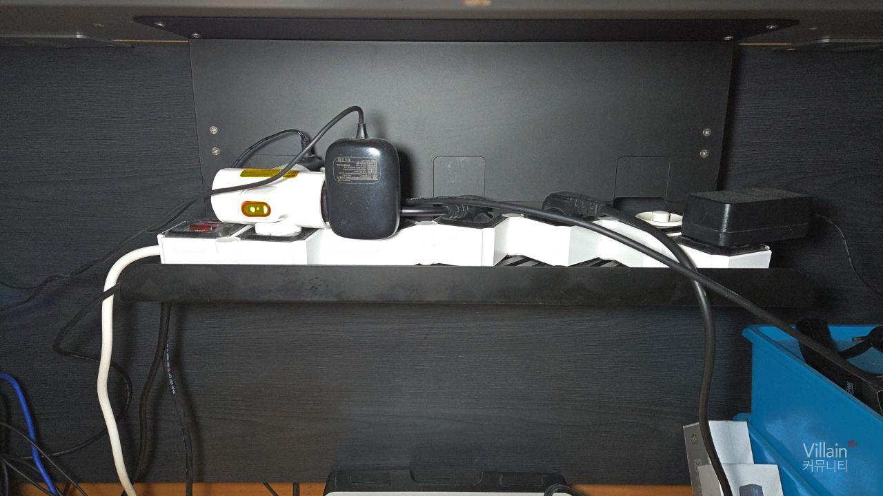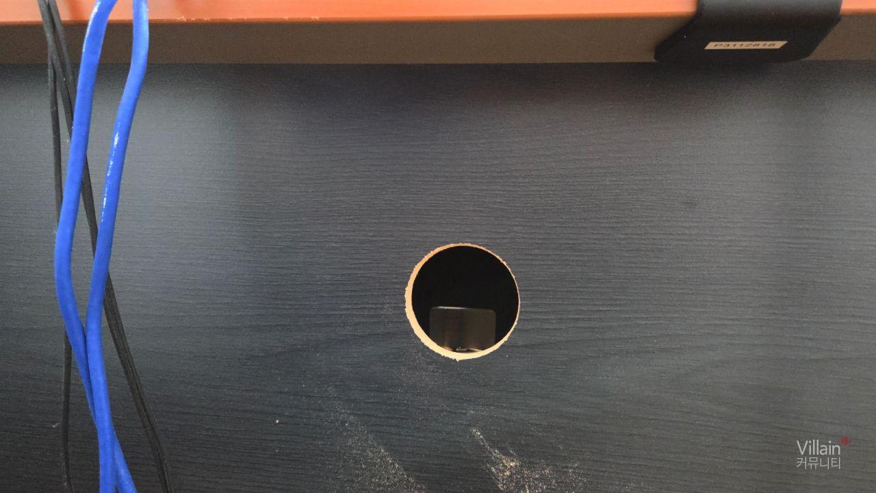 근데 안보이게 타공한다고 멀티탭 트레이 뒤에 타공해서 구멍으로 전원선 빼다가