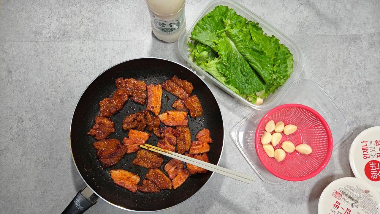 약간 하얀 아이들은 진공팩 냉장 훈제 삼겹살인데 양념이 묻어서….